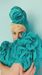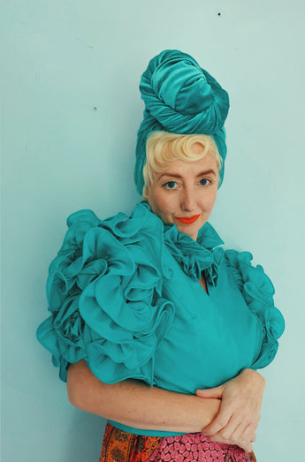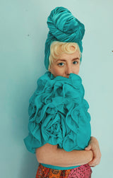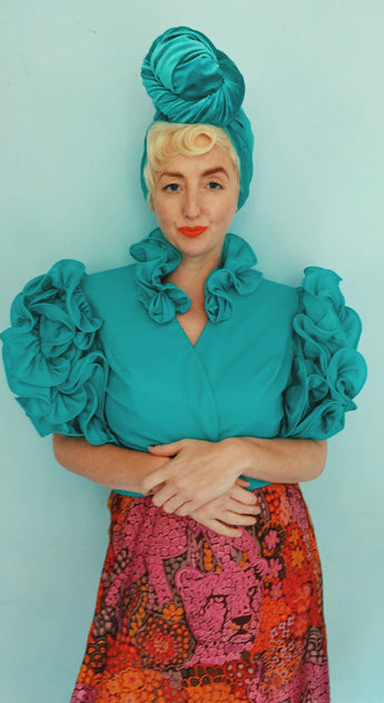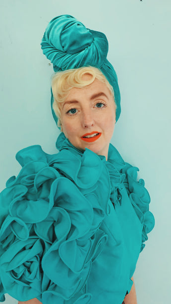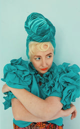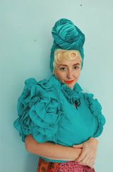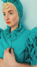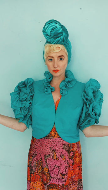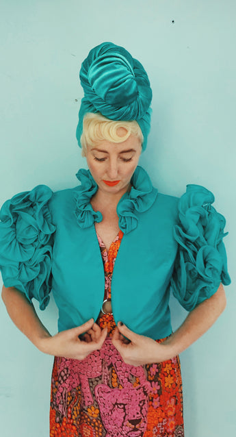 FABULOUS teal green OTT bolero with ruffles for sleeves and MORE around the collar too. No buttons, so would need a brooch to clutch shut if desired.