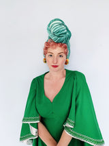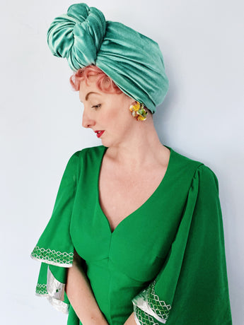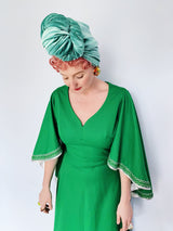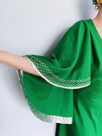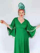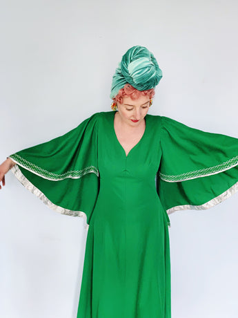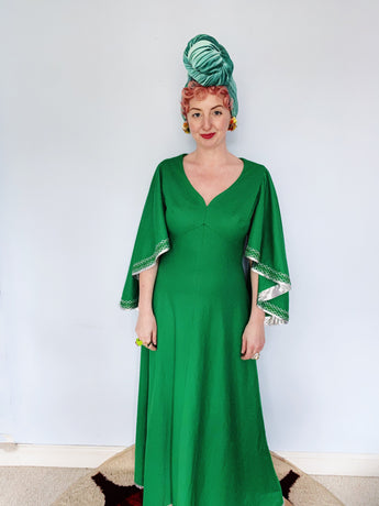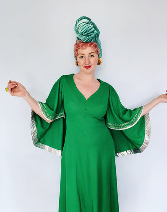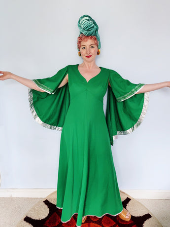 70s maxi Dress in a green non-stretch fabric with fitted bust and silver lame metallic trim. MASSIVE bell / angel sleeves. Ultimate love witch vibes. ICONIC.