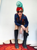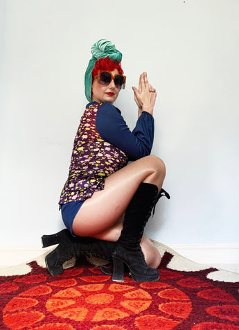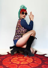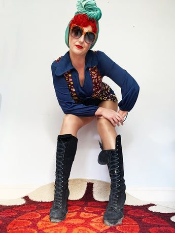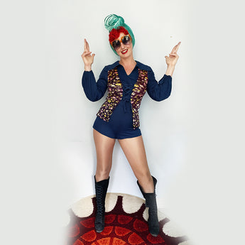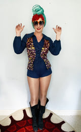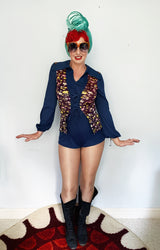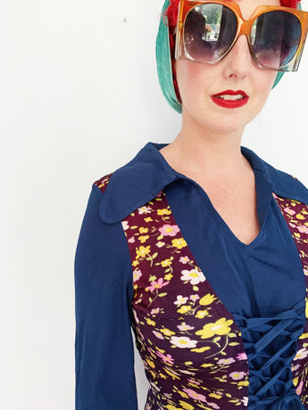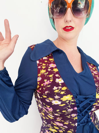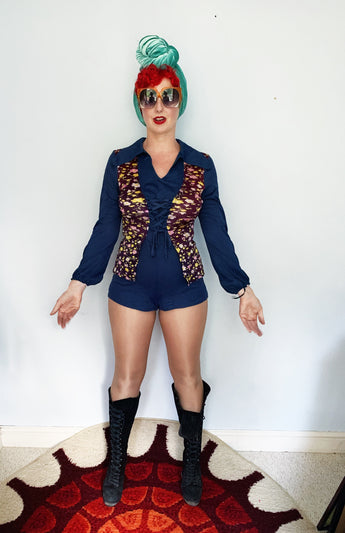 Vintage 70s Playsuit. 70s playsuit in navy blue with floral loose section on bodice with crisscross ties at front long elasticated puffed sleeves and big 70s collar