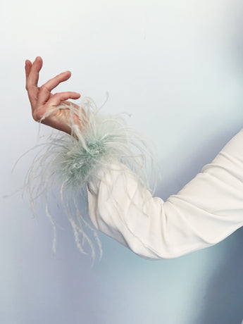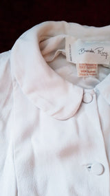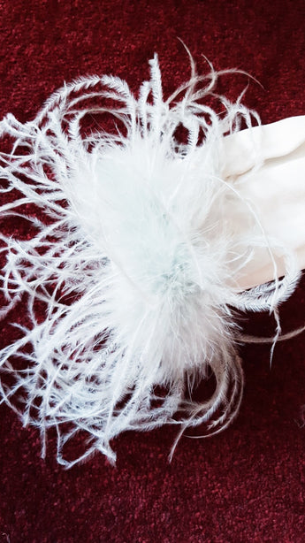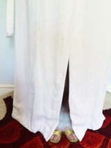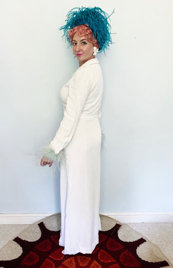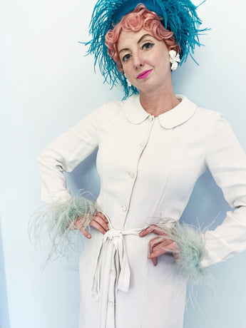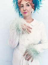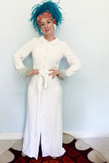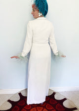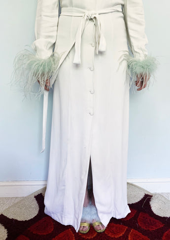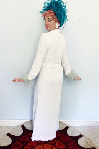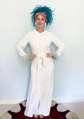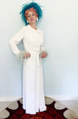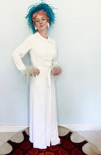Divine white dress / housecoat which buttons all the way up and secures with a belt. INCREDIBLE marabou trim on the sleeves and a front split up the front...
