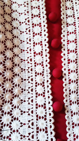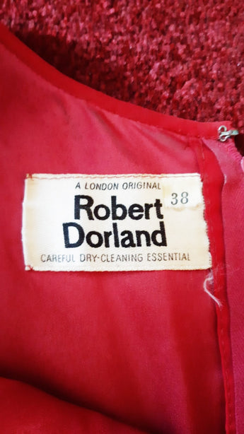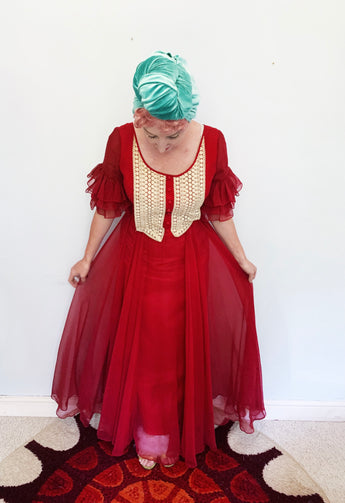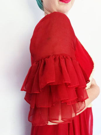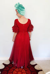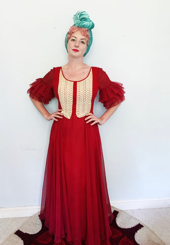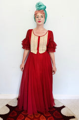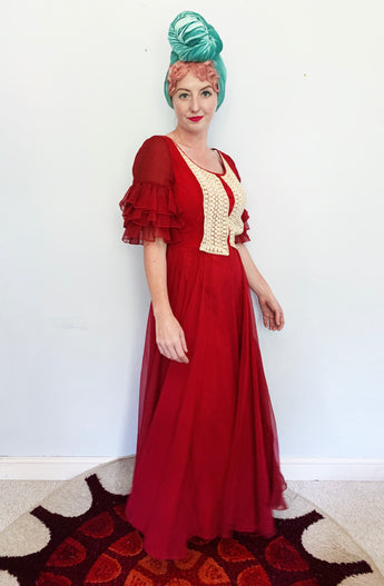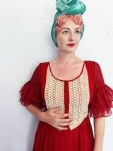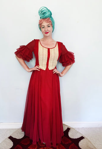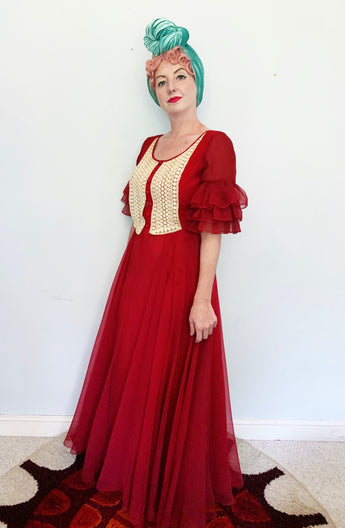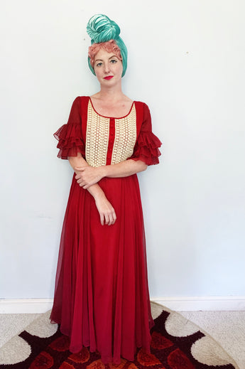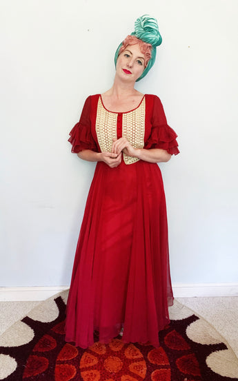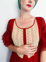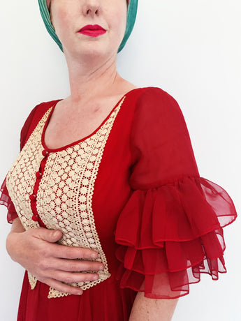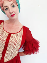 beautiful Red chiffon floaty folk dress with crochet front panel, ruffle sleeves, button up front and attached underskirt. Made by designer Robert Dorland, a London-based designer of the 1950s and 1960s who made elegant, bright, and colourful daywear and sophisticated highly detailed evening-wear.
