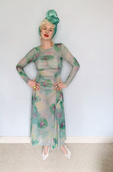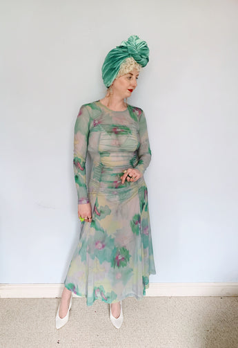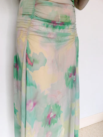Very pretty sheer mesh dress in a tie dye pattern in the colours of a zap ice lolly! The dress is see-through and ruched at the sides and stomach (very forgiving!) and the sides and the fabric is stretchy so lots of give.