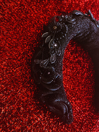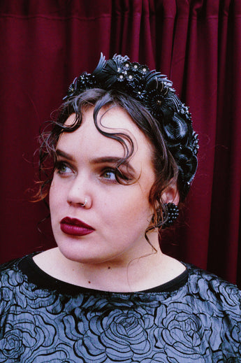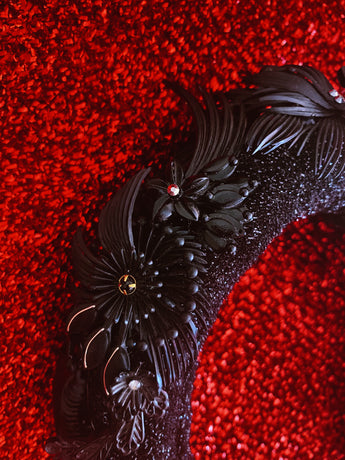 Padded and lurex covered black sparkle headband adorned with reworked vintage earrings and gems in feather and flower shapes.