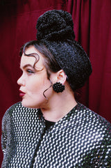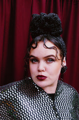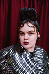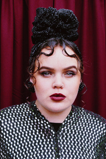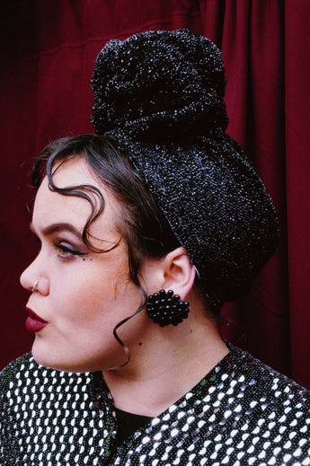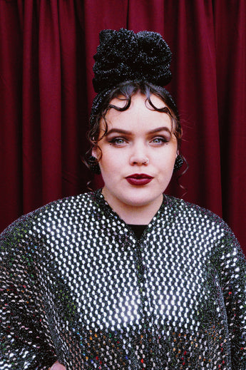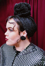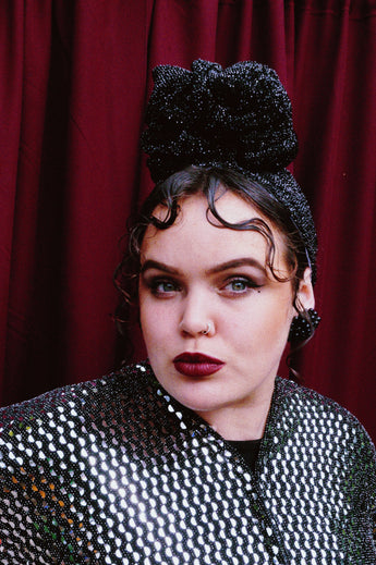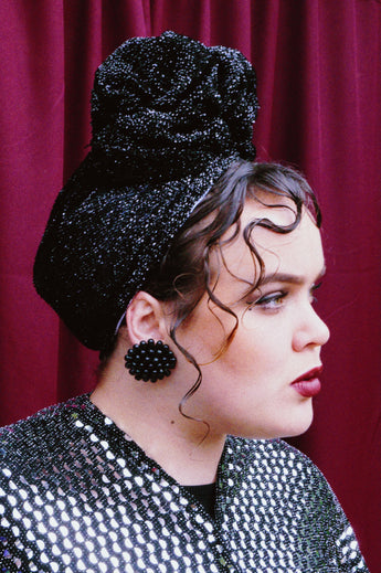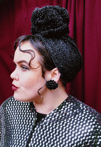 Studio 54 inspired turban in a stretch metallic knit tinsel Fabric in black tinsel knit. Turban may need to be secured with bobby pins / kirby grips to prevent slippage. Fully lined and all knots are hand stitched into place. Each design is made from a bespoke pattern so may not be identical to the design in the photos but will be very close.