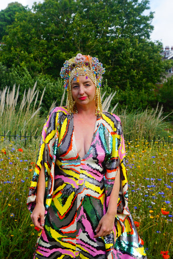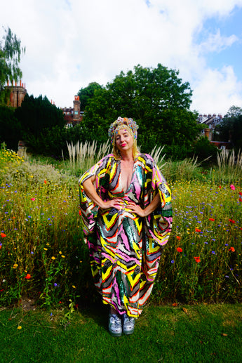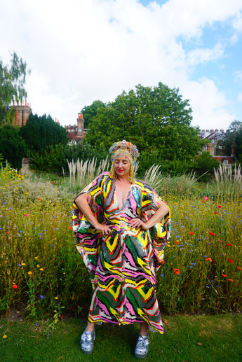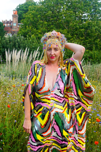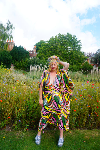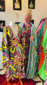 Our kaftan Gowns are uniquely fitted with hidden velvet ribbons on the inside meaning you can wear them two ways - 1) Free, loose and baggy, and 2) with the ribbons tied at the waist to pull the dress in and frame your figure.