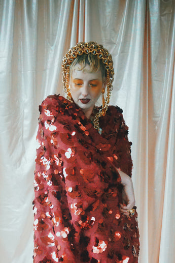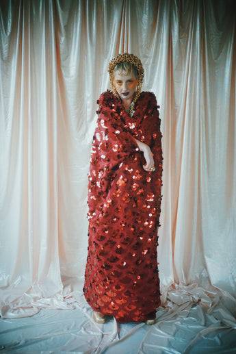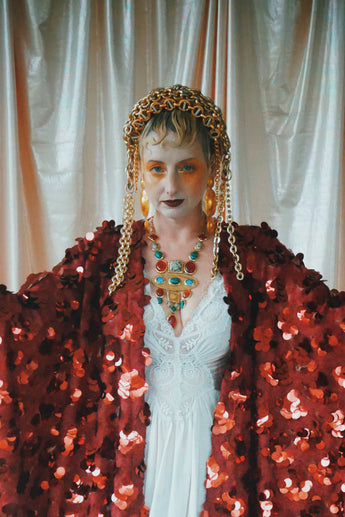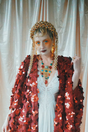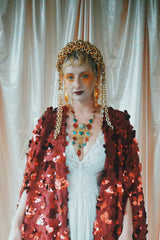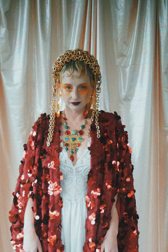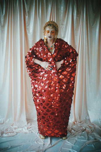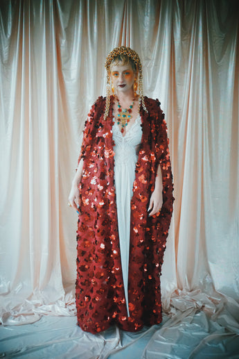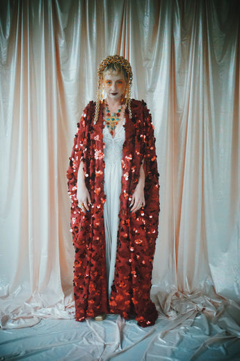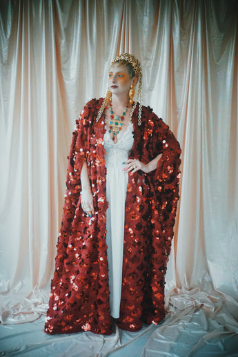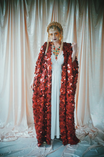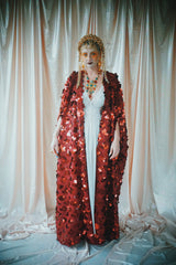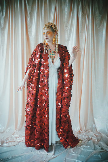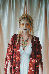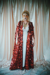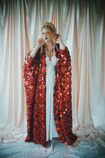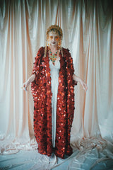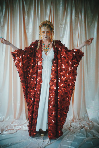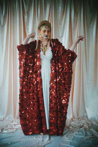 A stunning kimono robe dripping with large sequins on a mesh base…