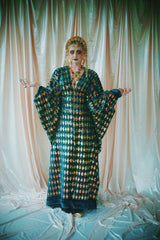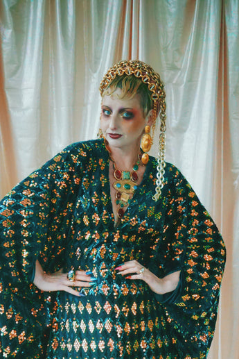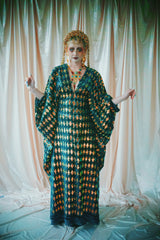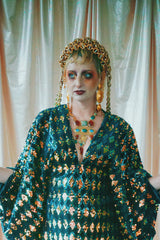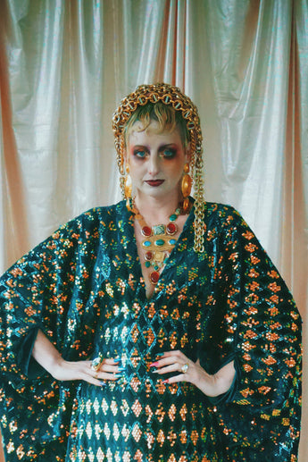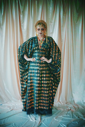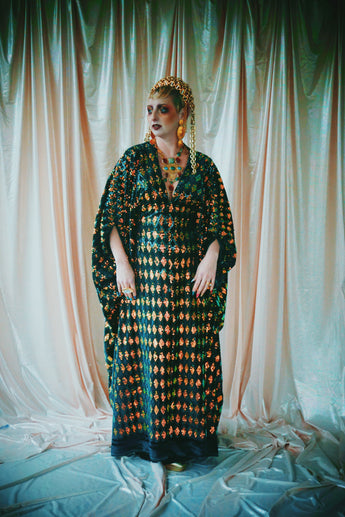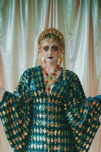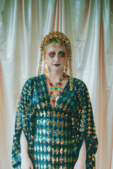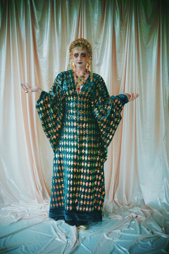 Green velvet base smothered in sequins in our standard kaftan style with hidden ribbons