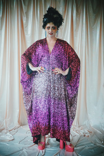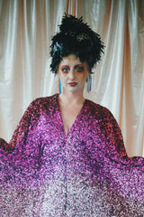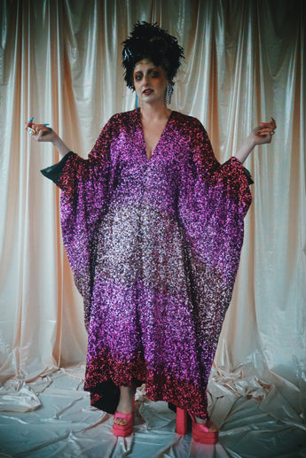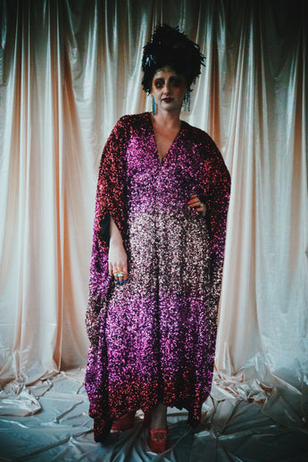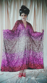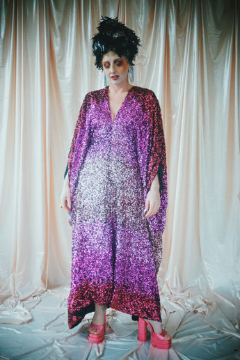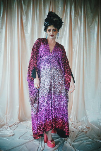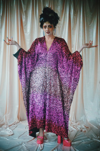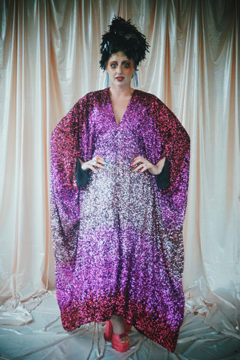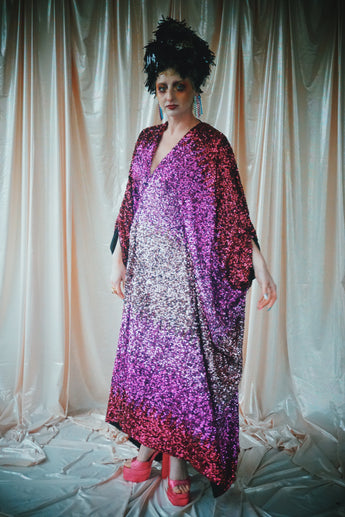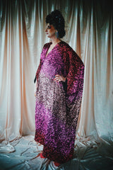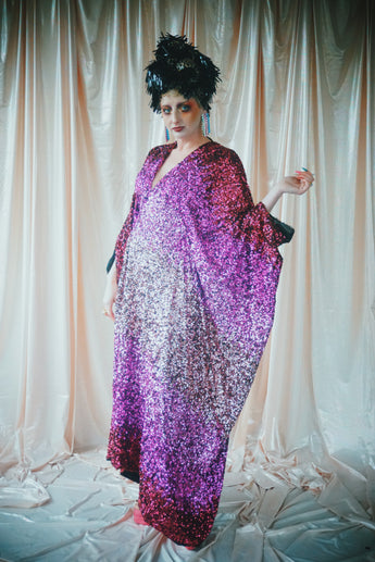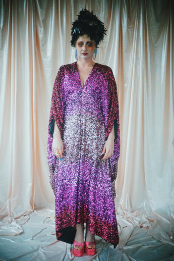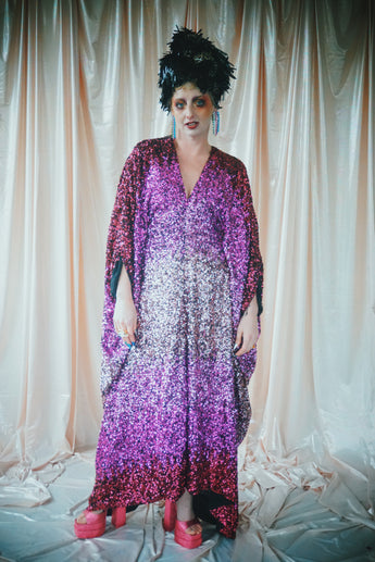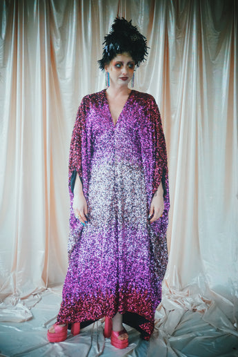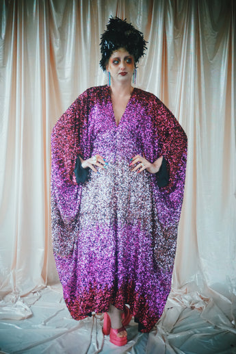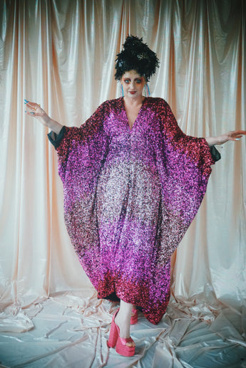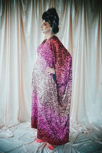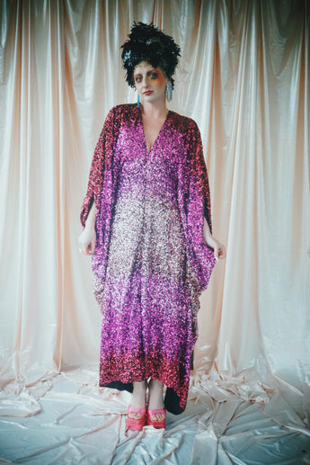 Delightful Pink ombre sequins in our v-neck kaftan style with hidden ribbons to cinch you in at the waist if desired.