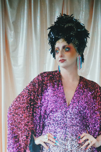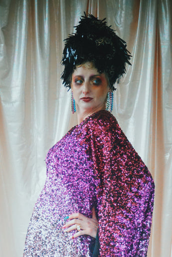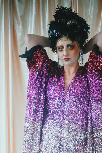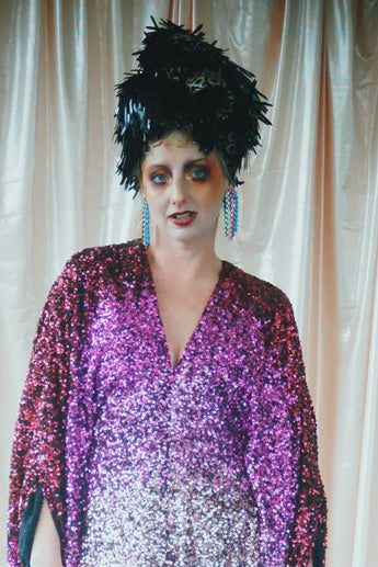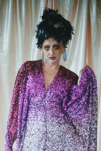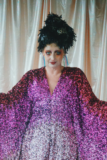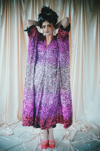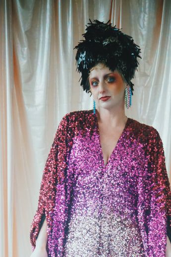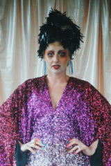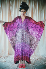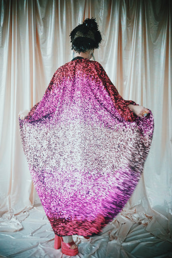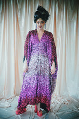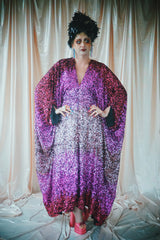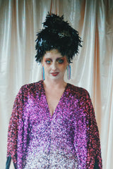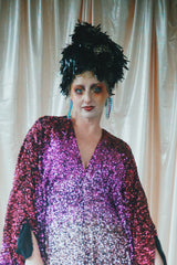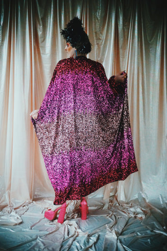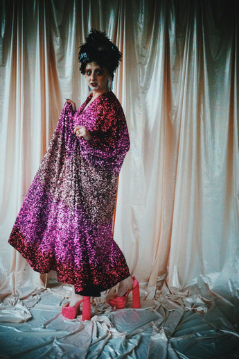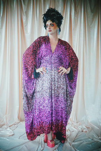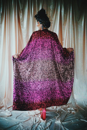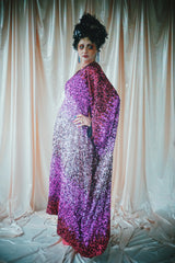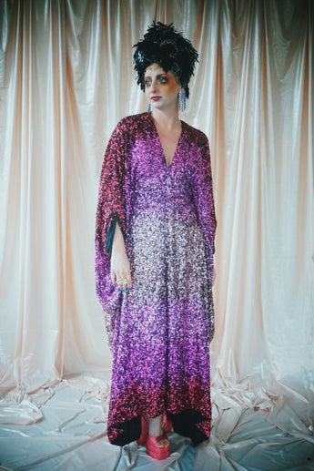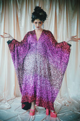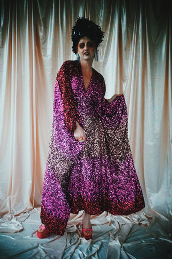 Delightful Pink ombre sequins in our v-neck kaftan style with hidden ribbons to cinch you in at the waist if desired.