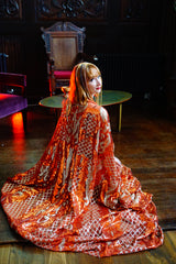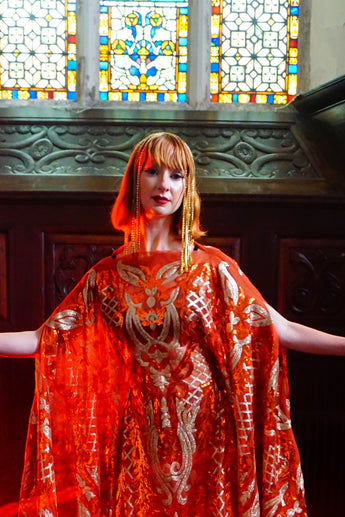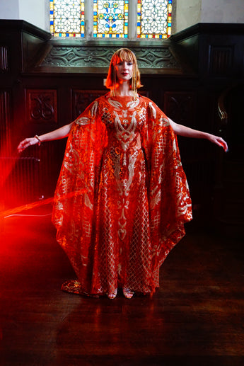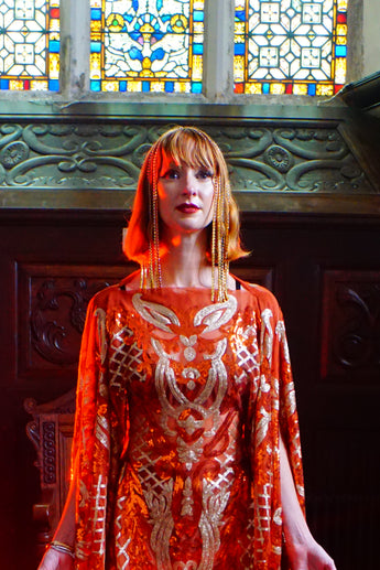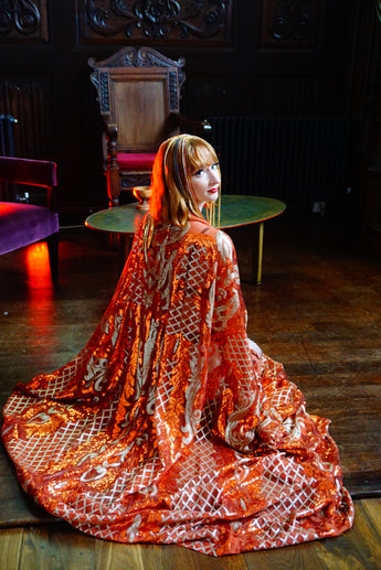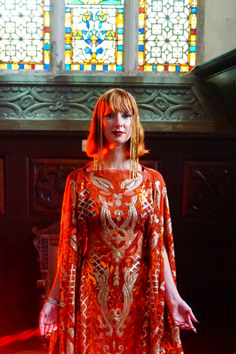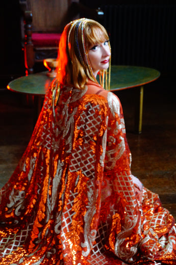 An exquisite adornment of gold and orange sequins in striking ornamental design with a slash neck finish.