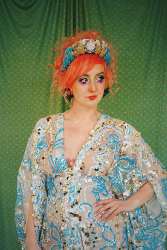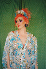 An exquisite adornment of gold, white blue and iridescent sequins which look to simply drip off the body…