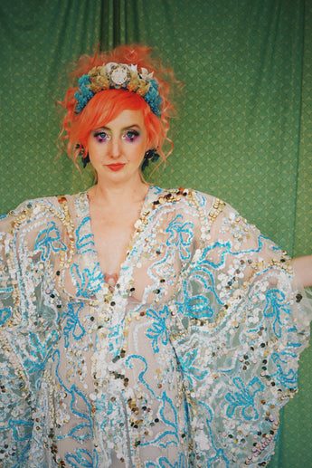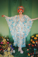 The dress is quite sheer and Worn here with a nude bra and fitted body underneath to add to the illusion of the dripping of the sparkles, however you can wear with a white slip or maxi dress or even another kaftan underneath if you prefer to be more covered up. Worn with our hidden ribbons tied to cinch in at the waist (can also be worn loose).