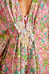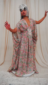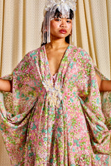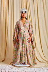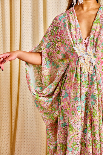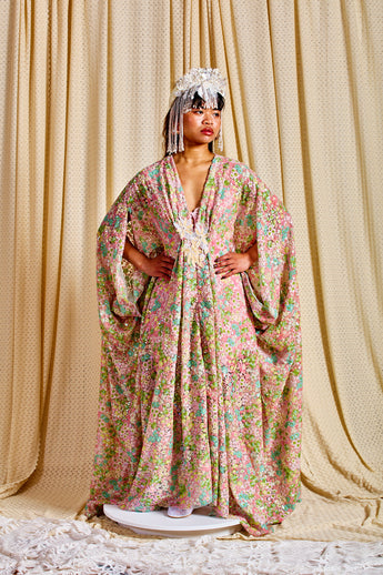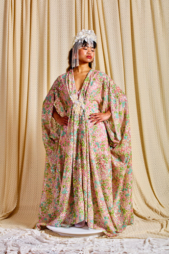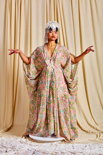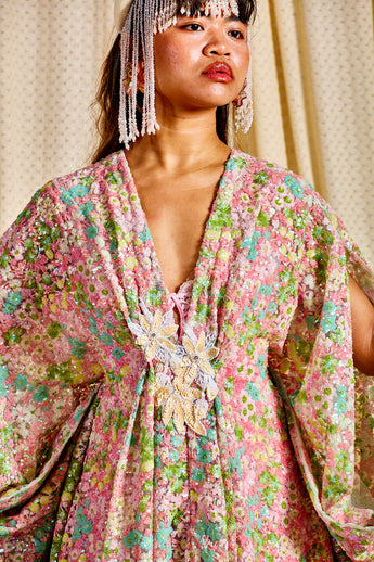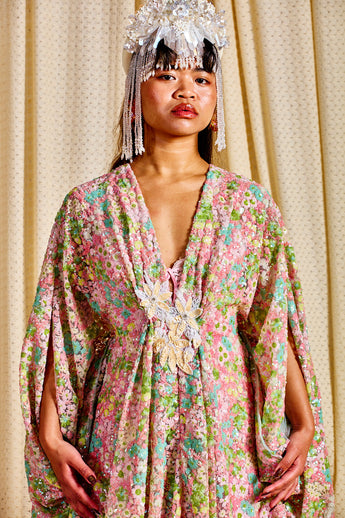 Meadow Sequin Deep V-Neck Kaftan Gown with central hand-stitched sequin embellishment detail on the neckline and a ruched centre and arms. The fabric features delicate sequinned flowers in soft pastel tones, scattered across a blush mesh base. Please note this is a heavy weight fabric and there is lots of it.