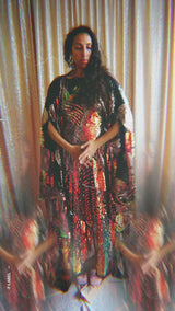 Our kaftan Gowns are uniquely fitted with hidden velvet ribbons on the inside meaning you can wear them two ways - 1) Free, loose and baggy, and 2) with the ribbons tied at the waist to pull the dress in and frame your figure.
