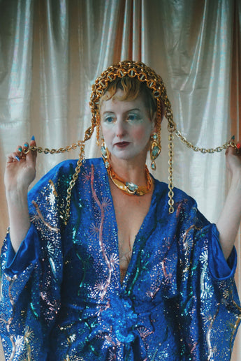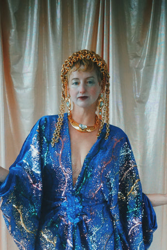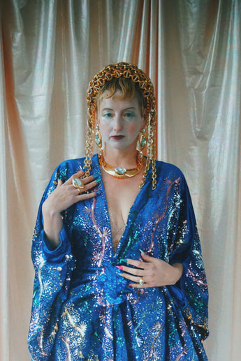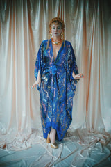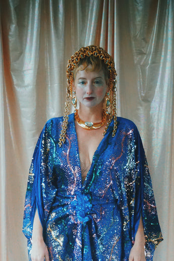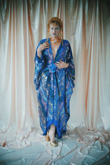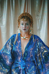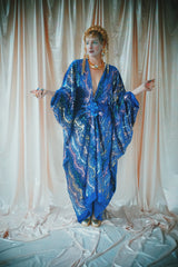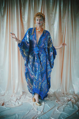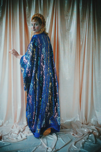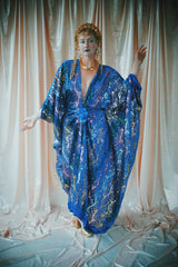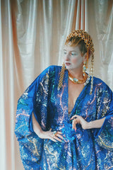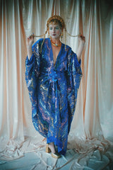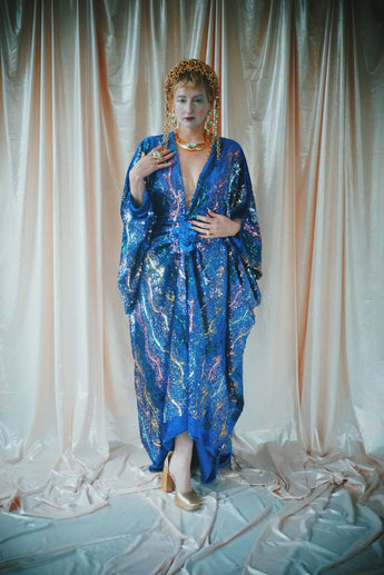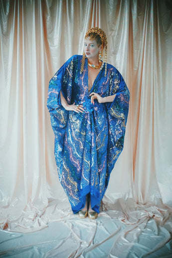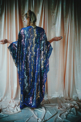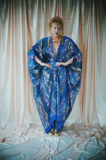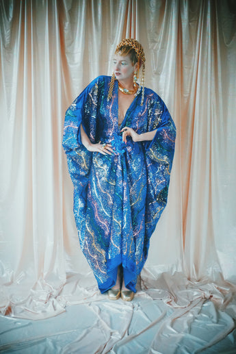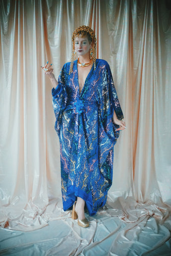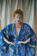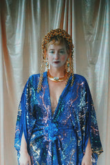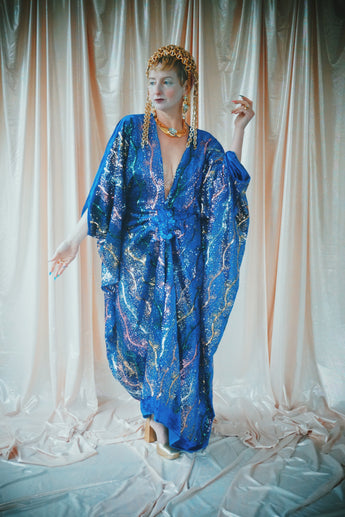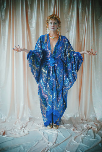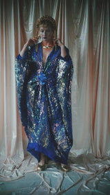 no.8 Firecracker - Blue velvet sequin adorned plunge batwing kaftan gown