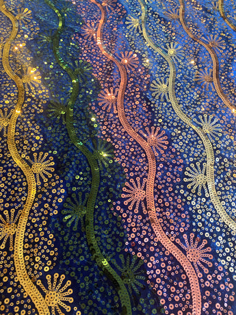 A firework of patterned sequins in pink, green, gold and silver on a deep blue velvet base. Made in our 1930s art deco inspired batwing style with central sequin and beaded embellishment.