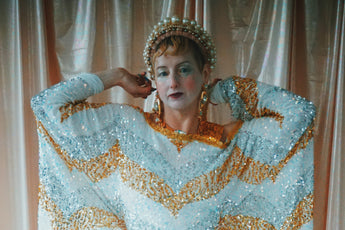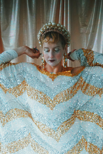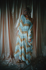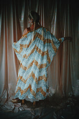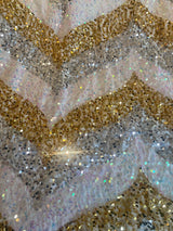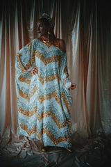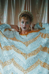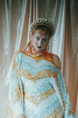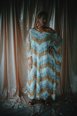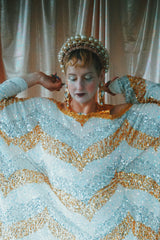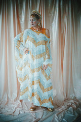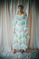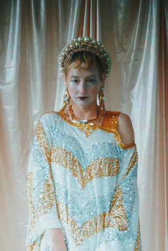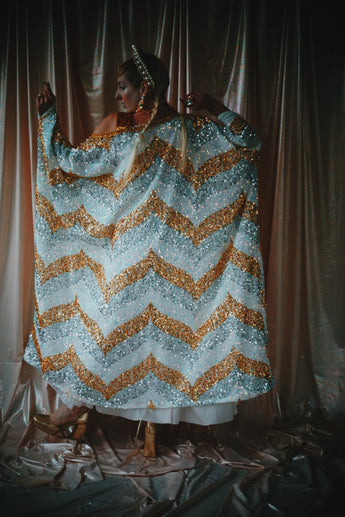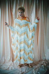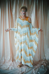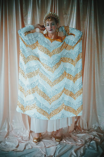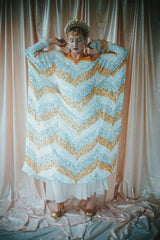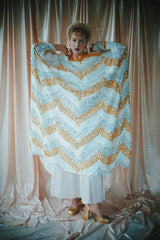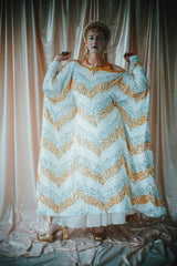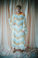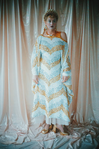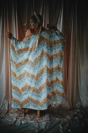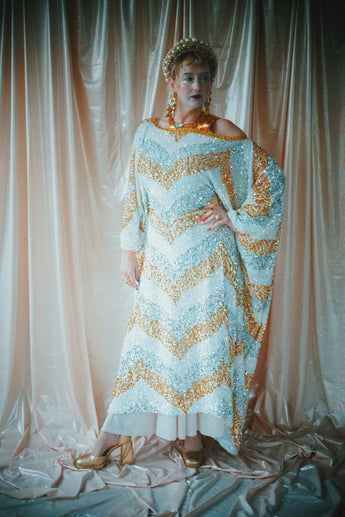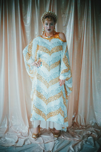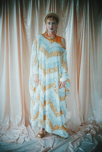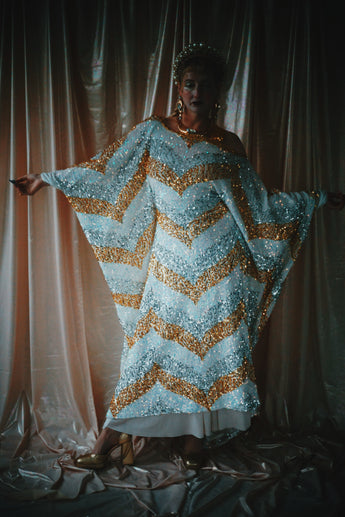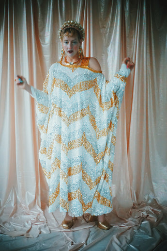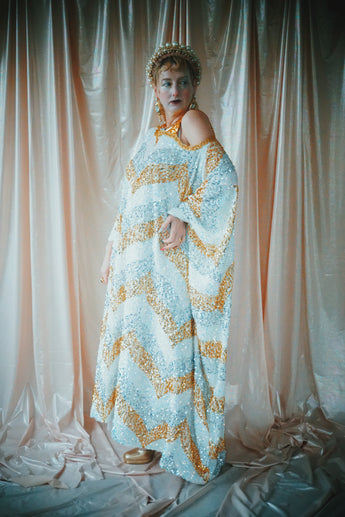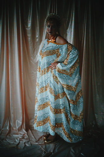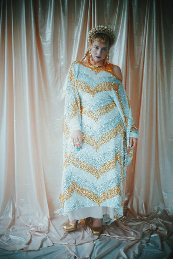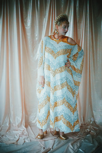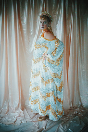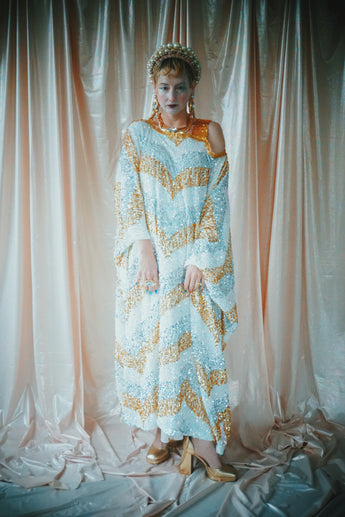 A new design for our F label line. An off the shoulder Grecian inspired kaftan gown with sequinned thick gold strap on one shoulder and an oversized slouch batwing arm at the other. Stunning arrow patterned sequins in gold silver and iridescent make up this striking and elegant pattern.