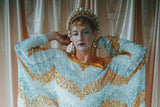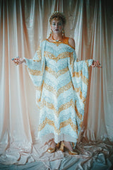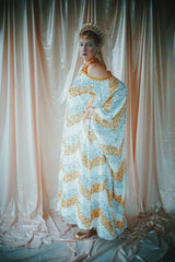NO.6 Gold, Silver and iridescent sequin velvet off the shoulder Grecian inspired kaftan gown