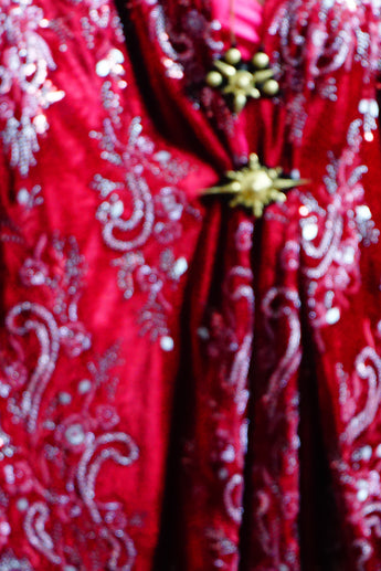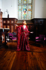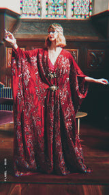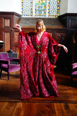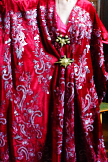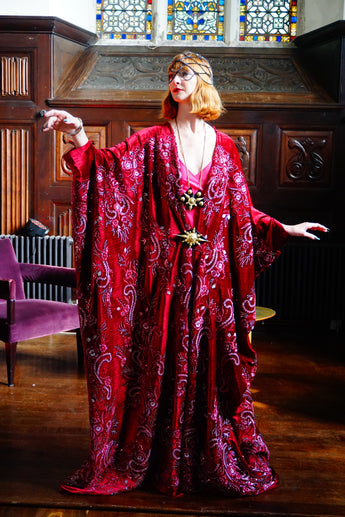 A luxurious deep burgundy red with hints of glitter velvet fabric adorned with delicate sequins and beads and embroidery on this kimono robe creates a stunning garment. Handstitched seams due to masses of beading and embellishments