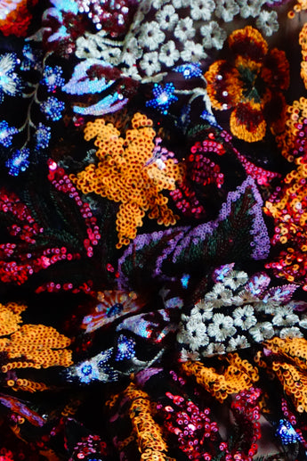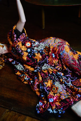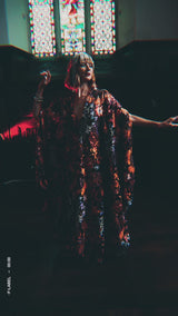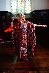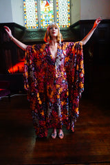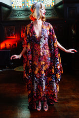 The kaftan gown is adorned with a beautiful medley of sequin and embroidered flowers in warm, vibrant colours, creating an exquisite and eye-catching design. Made in our Major sleeve style, the dress is extra wide, masses of fabric with wonderful drape to the sleeves and a v-neck style finish. With extra large drooping sleeves (sewn together with a gap for the arms to fit through) and our hidden ribbons.