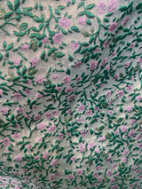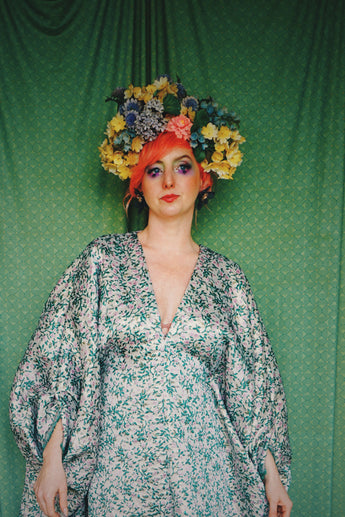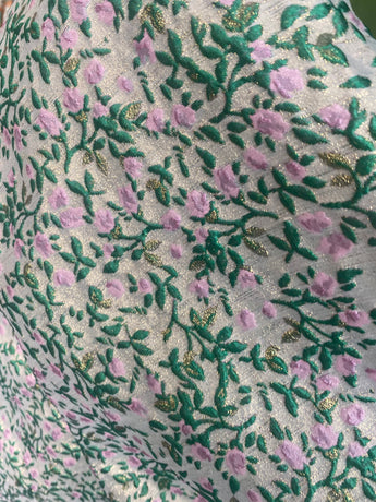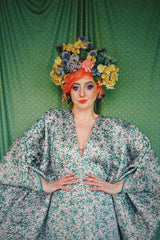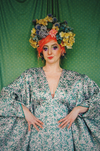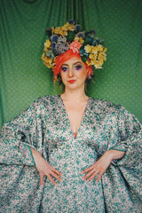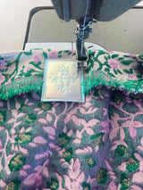 Incredibly beautiful Jacquard fabric of a light-medium weight in a print of purple and green flower buds and metallic gold thread woven throughout. Worn with our hidden ribbons tied to cinch in at the waist (can also be worn loose).