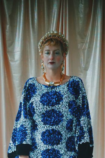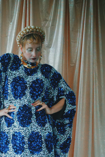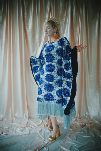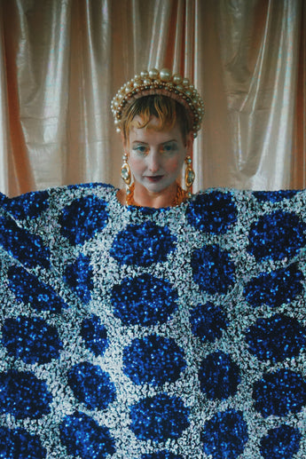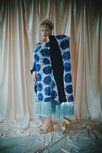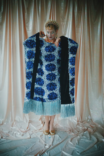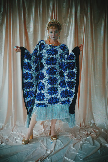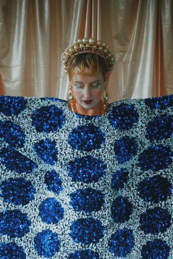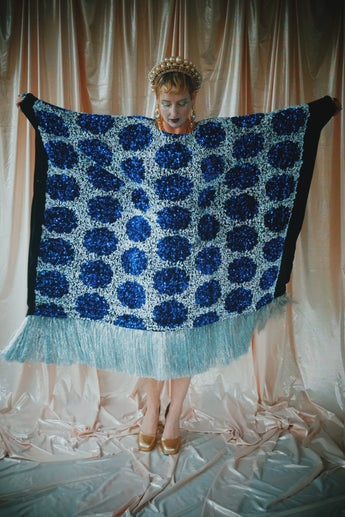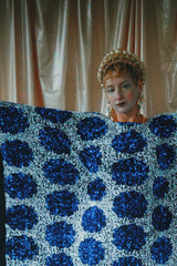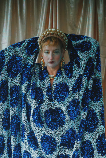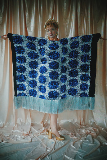 The most incredible bold print of extra large Blue sequins in a circular shapes dotted around a bed of iridescent white sequins on a black velvet base…