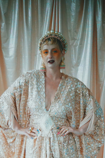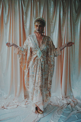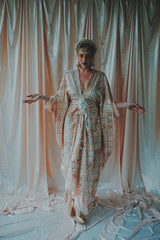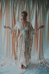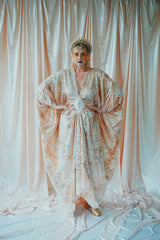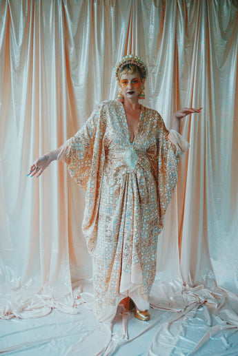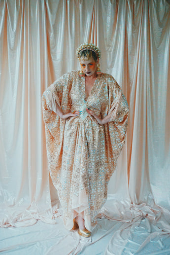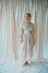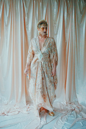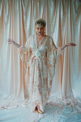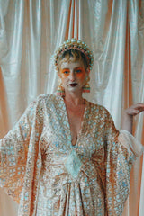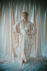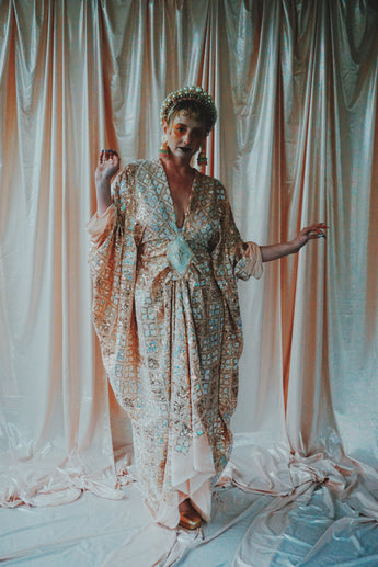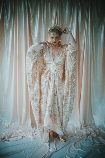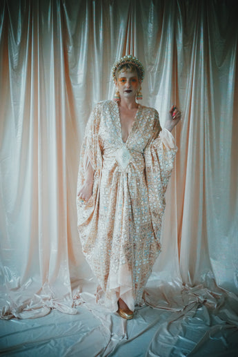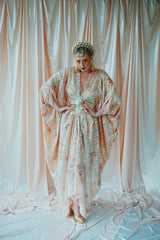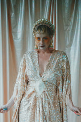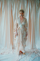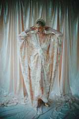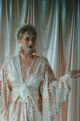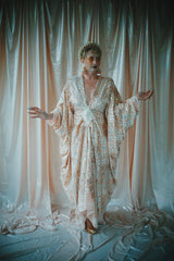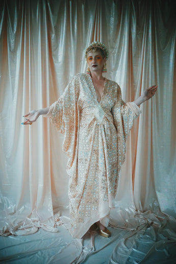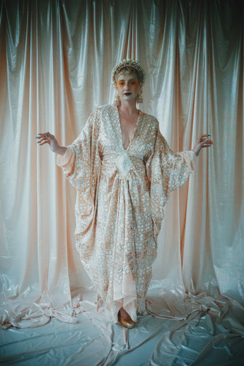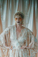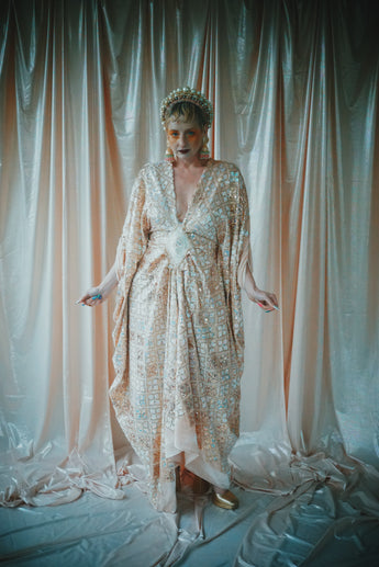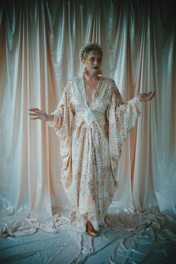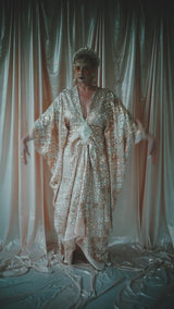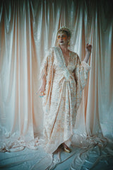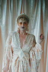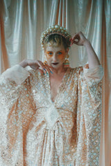 A beautiful rich cream velvet decorated in iridescent and gold sequin leaf shapes with our ruched centre and vintage diamond appliqué, low neck plunge, batwing sleeved arms and our hidden ribbons to pull you in at the waist if desired.