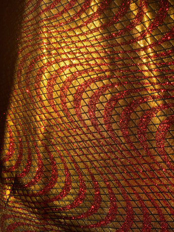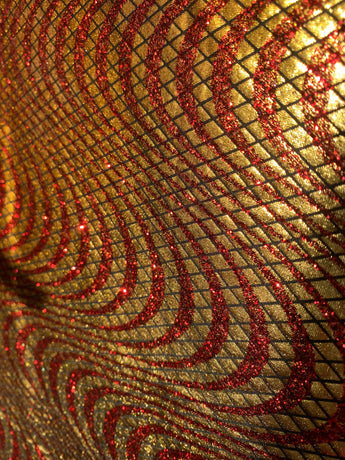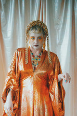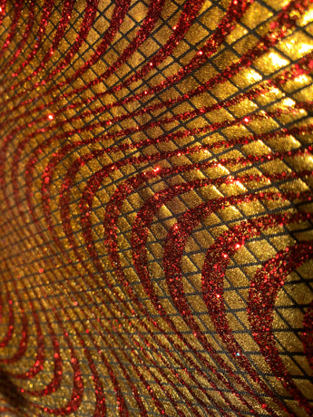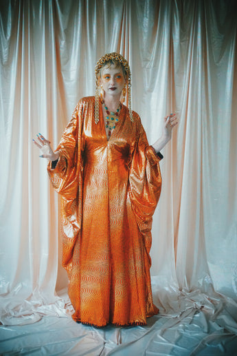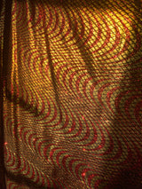 Metallic gold and red foil and glitter in a swirled pattern - incredibly slinky and futuristic and in our V-neck kaftan design with hidden Ribbons