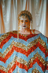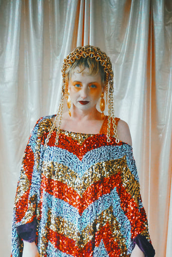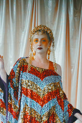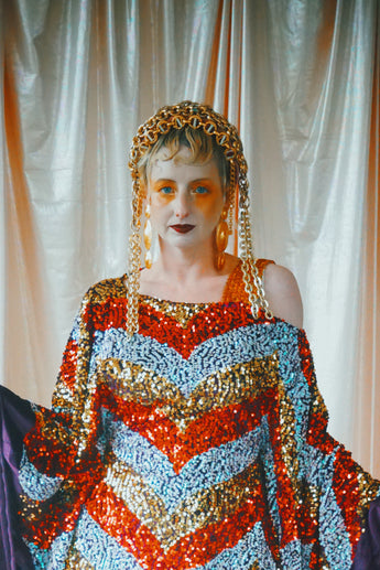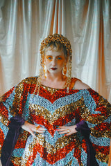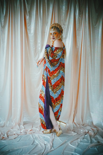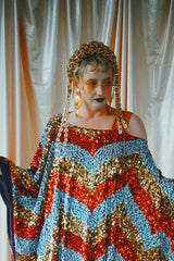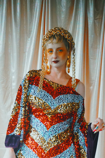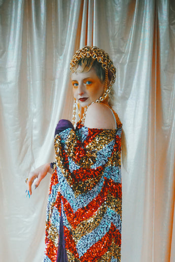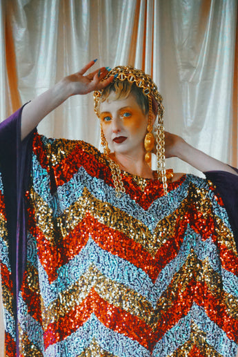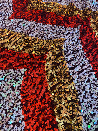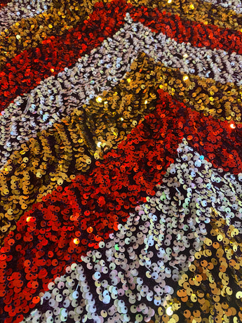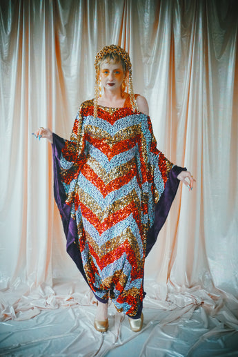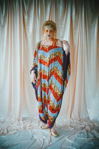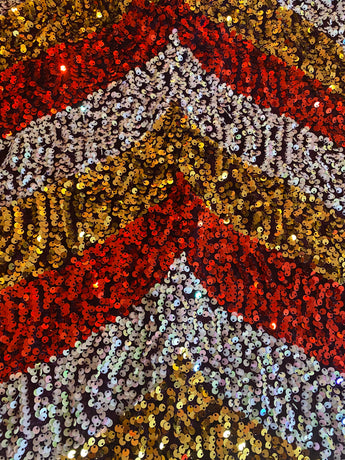 The fabric is an incredible rich purple velvet with gold white iridescent and red sequins in an arrow like pattern.
