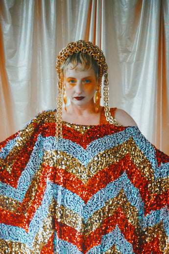 Fitted with hidden velvet ribbons on the inside meaning you can wear them two ways - 1) Free, loose and baggy, and 2) with the ribbons tied at the waist to pull the dress in and frame your figure.