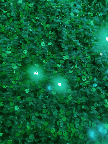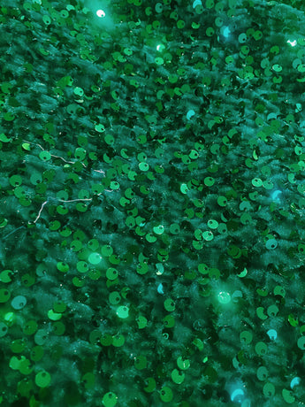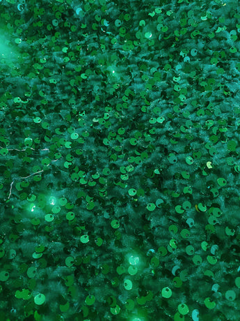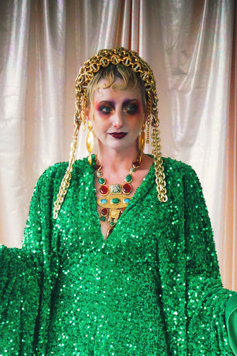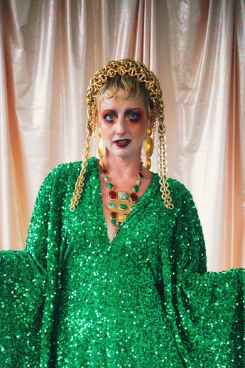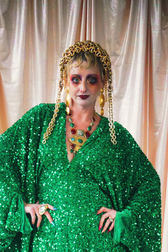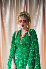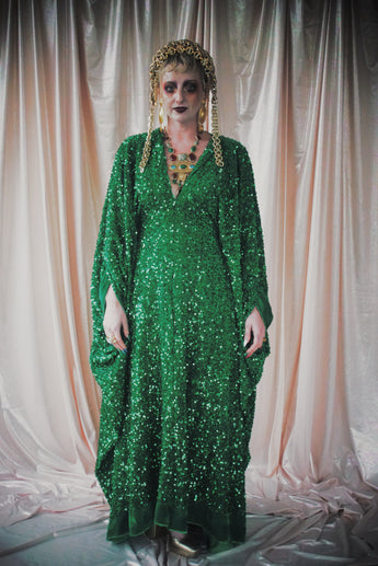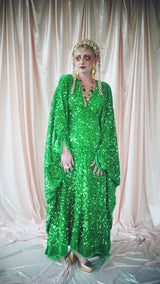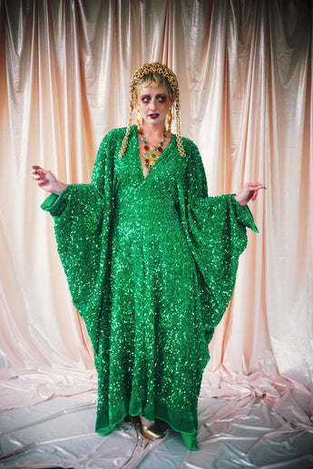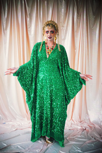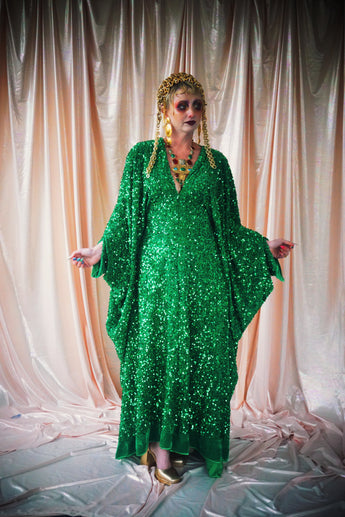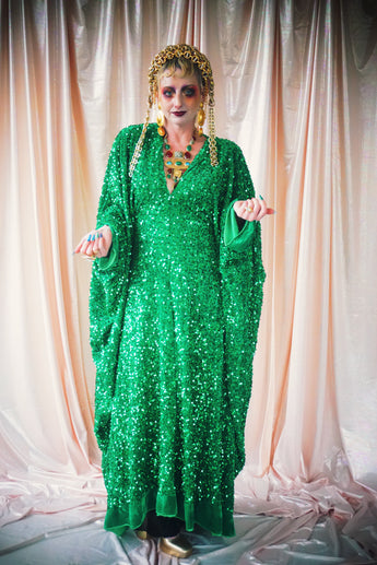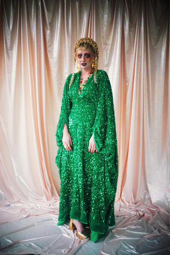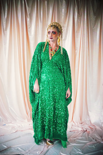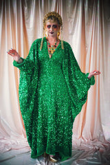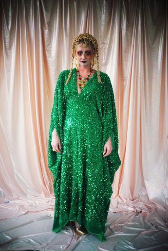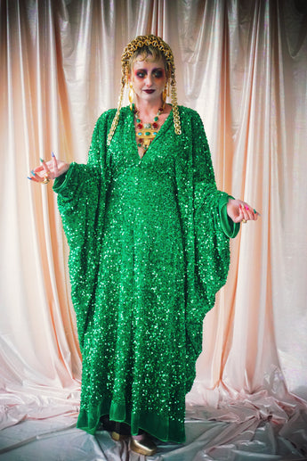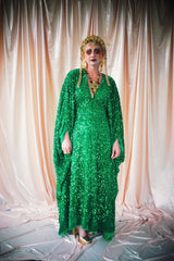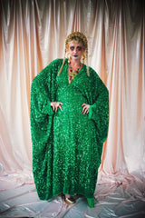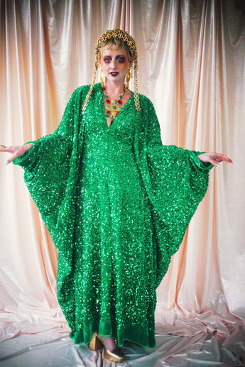 Green velvet base smothered in sequins in our standard V-neck kaftan style Gown with hidden ribbons.
