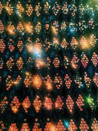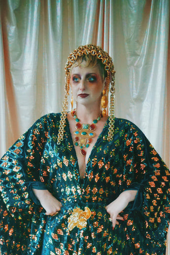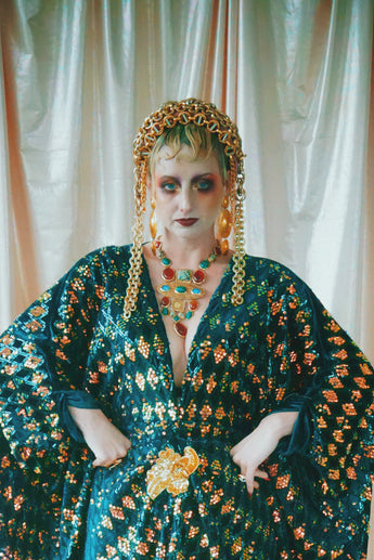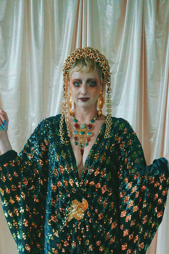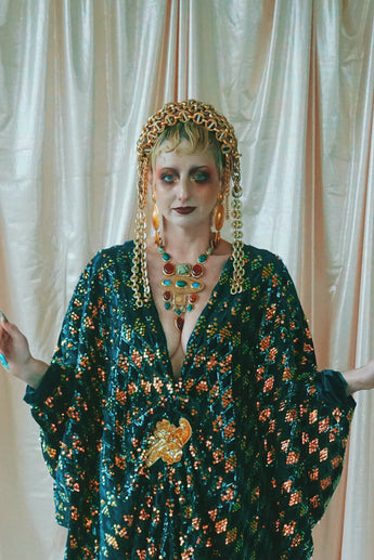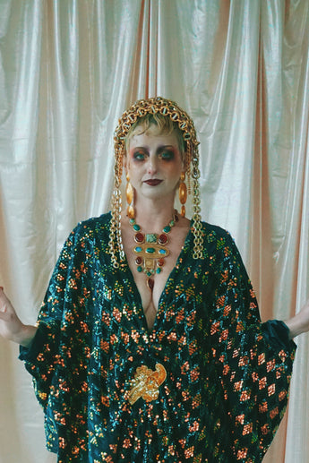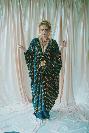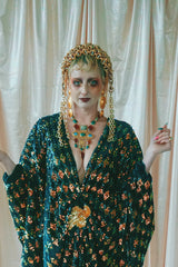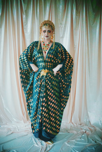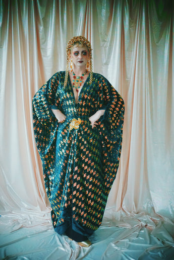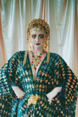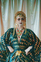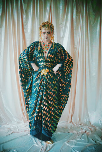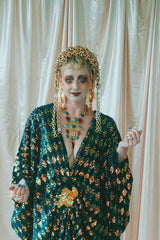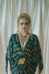 Green velvet base smothered in sequins in our deep plunge Batwing Plunge Kaftan Ruched Dress style with hidden ribbons (No split up front)