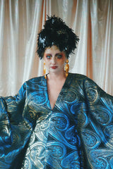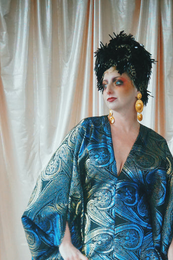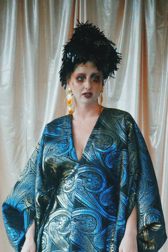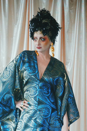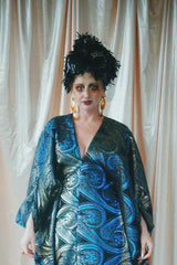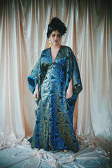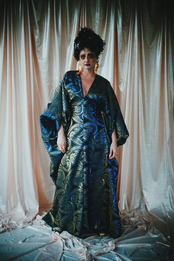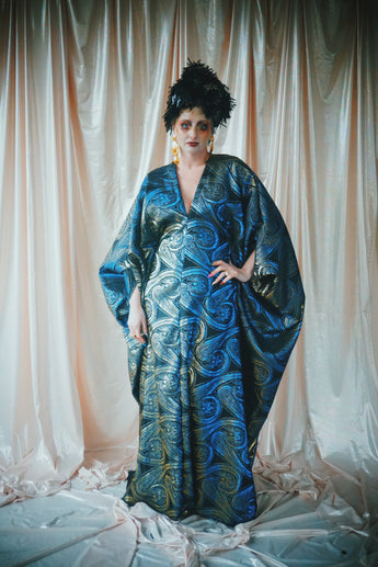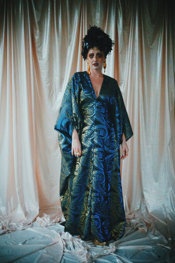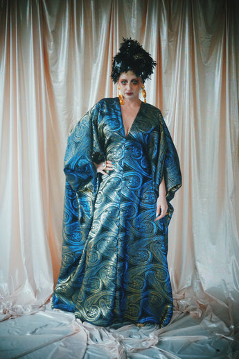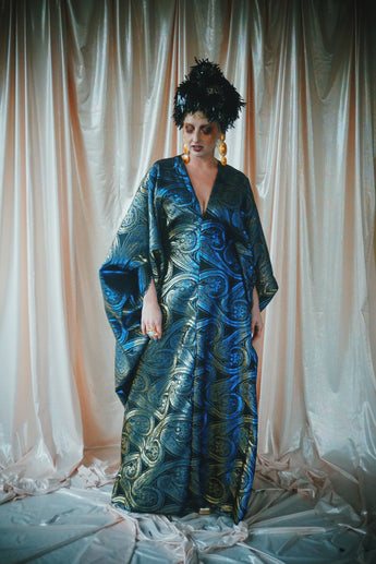 And incredible textured Brocade Blue/silver/gold metallic V- Neck kaftan Gown with our signature hidden ribbons.