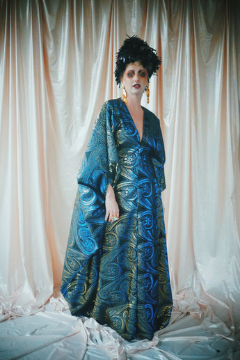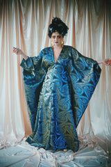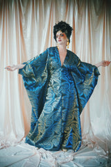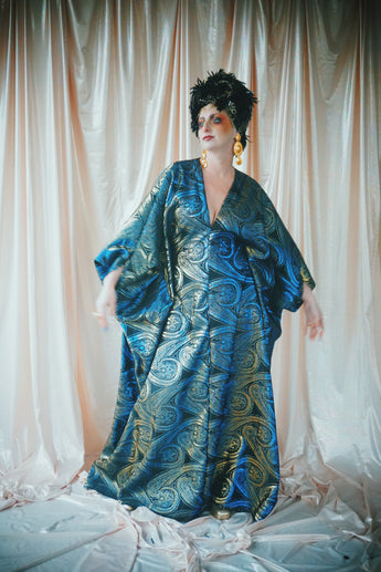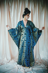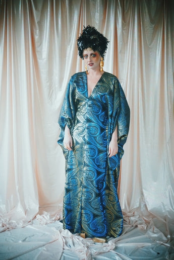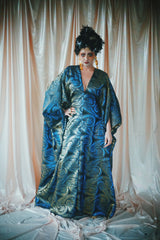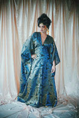 No.43 Misty Blue - gold and blue metallic brocade V- Neck kaftan Gown