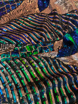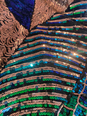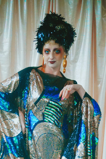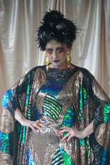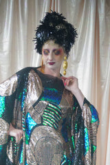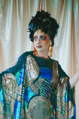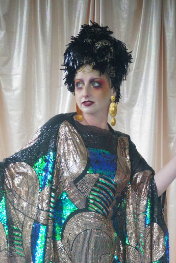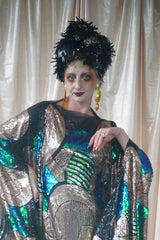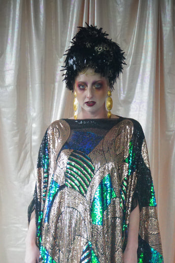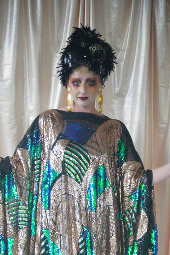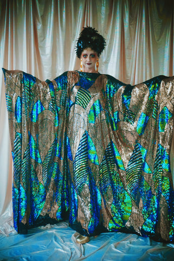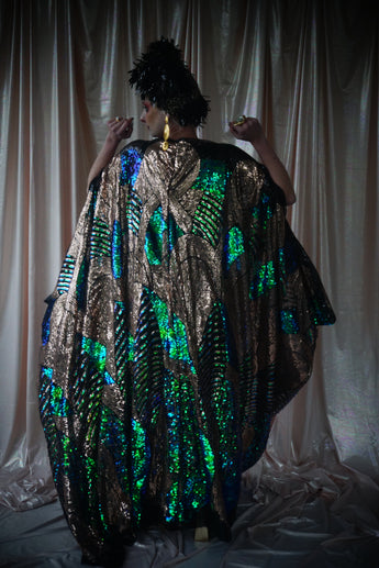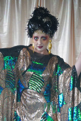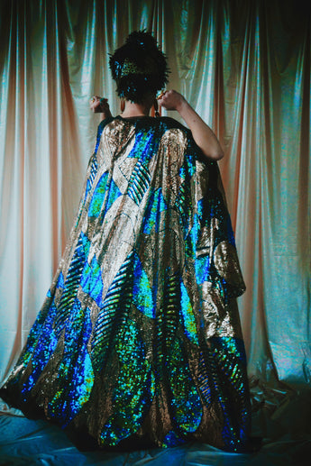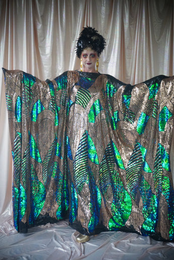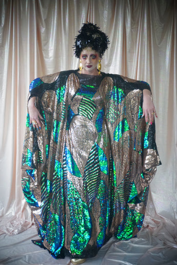 Masses of sequin fabric in golds, blues, greens, holographics and black in a new slash neck design with extra large drooping sleeves (sewn together with a gap for the arms to fit through) and our hidden ribbons.