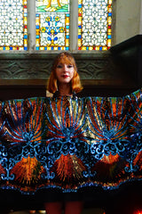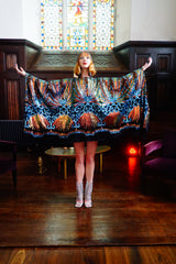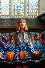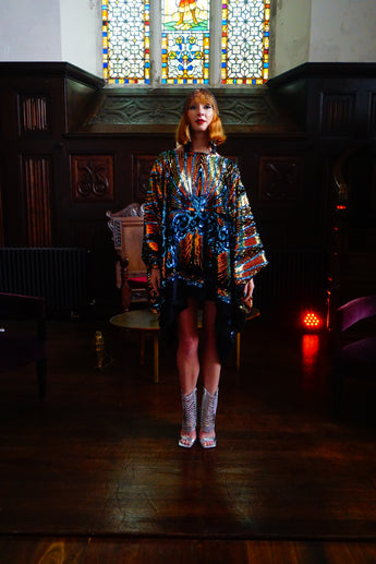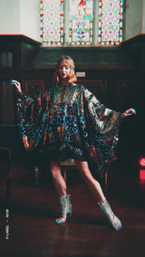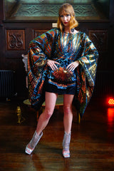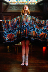 An exquisite mini kaftan with a beautiful art nouveau design in contrasting blue and orange sequins. Super wide (with small cuffs to compensate) a super mini length adn heart motifs.