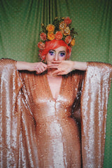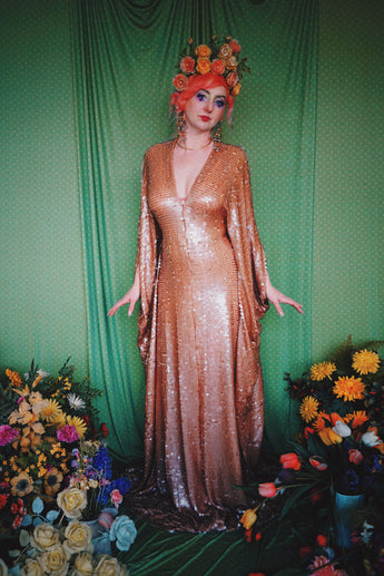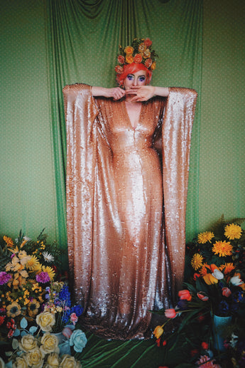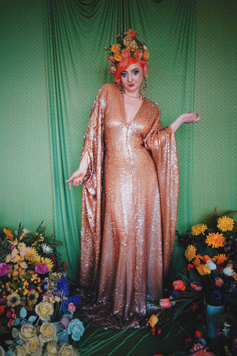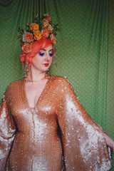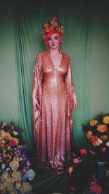 Super Slinky gown with clear sequins which seem to drip off the body. Super long with trail and worn with our hidden ribbons tied to cinch in at the waist (can also be worn loose).