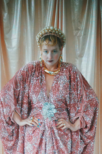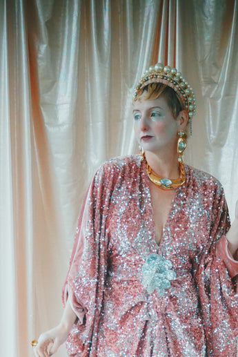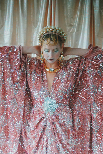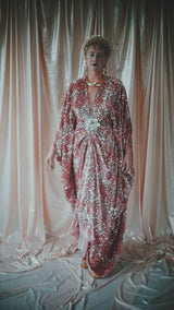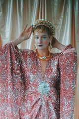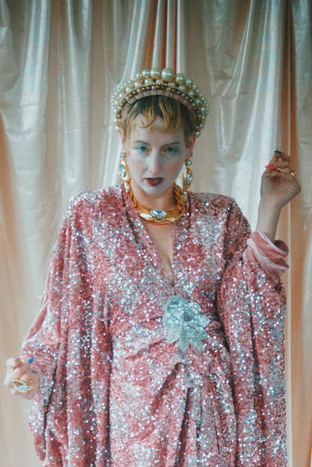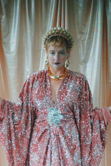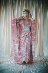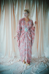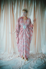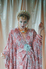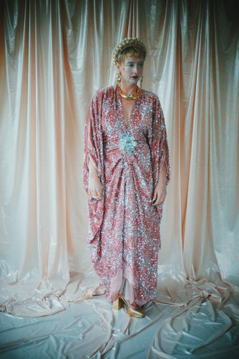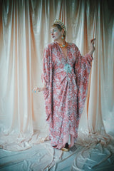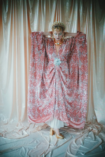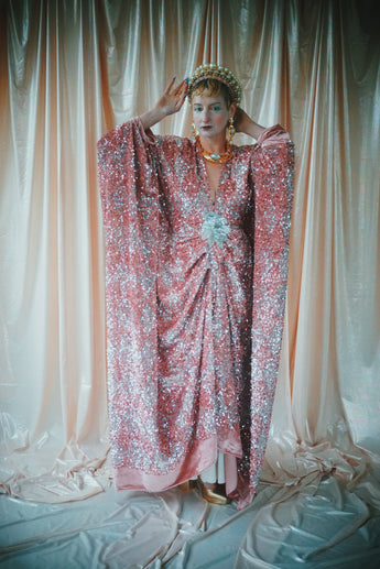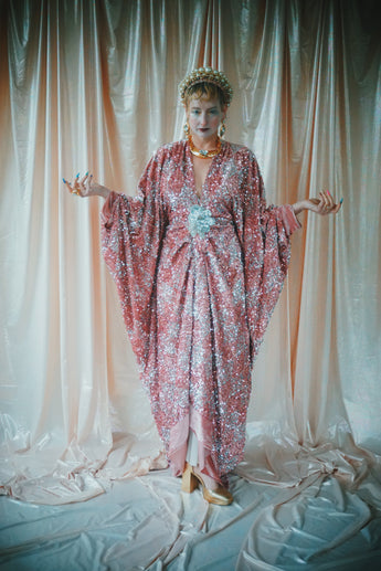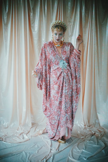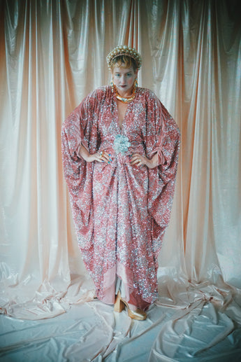 NO.5 Pink Lady - Pink velvet with silver sequins batwing Kaftan Gown
