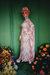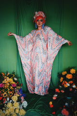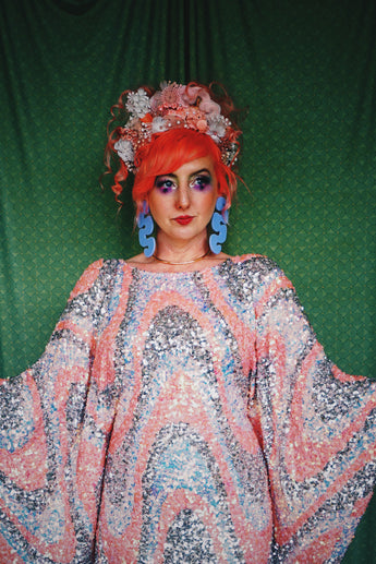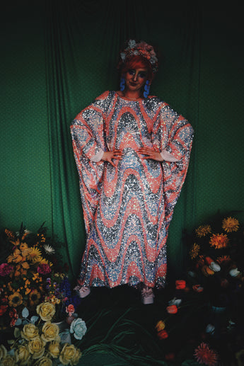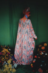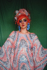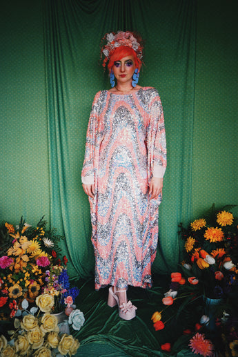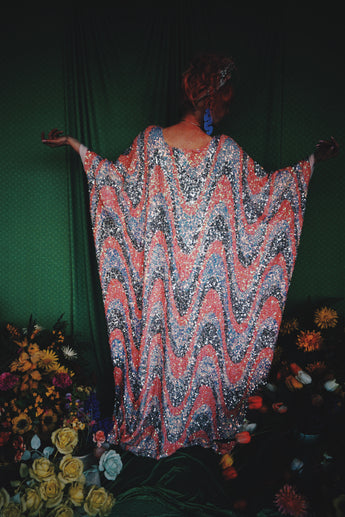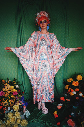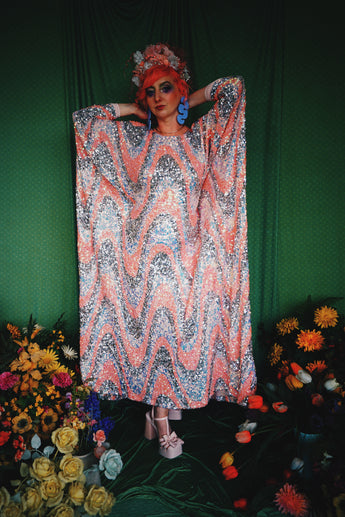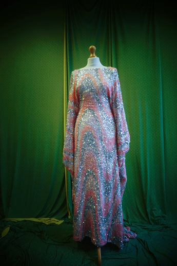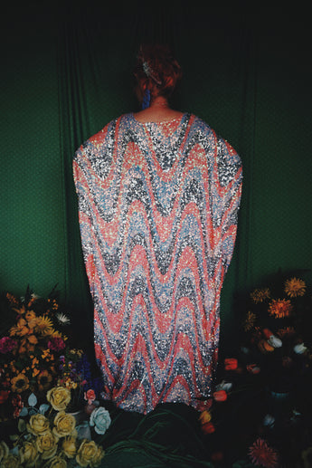 Candyfloss - Round Neck Coral, Silver, Iridescent Swirl Sequin Kaftan Maxi Gown
