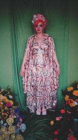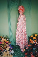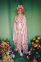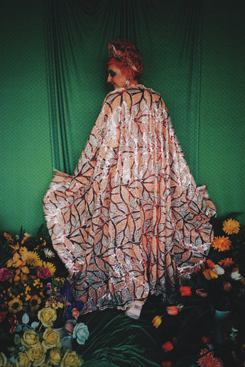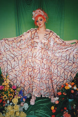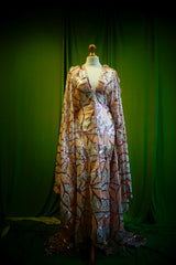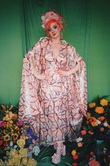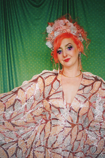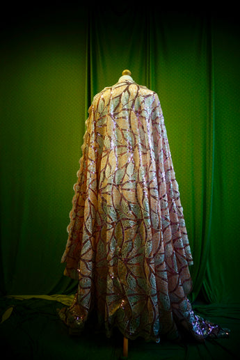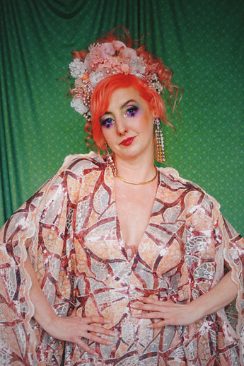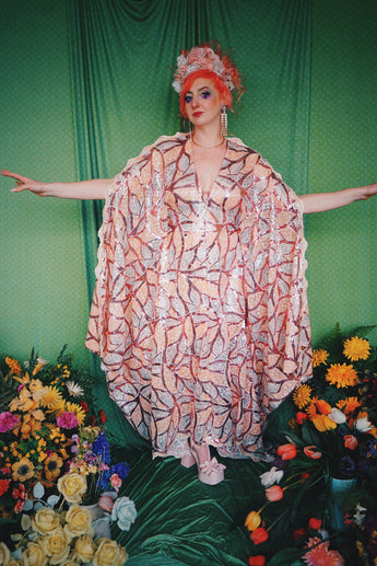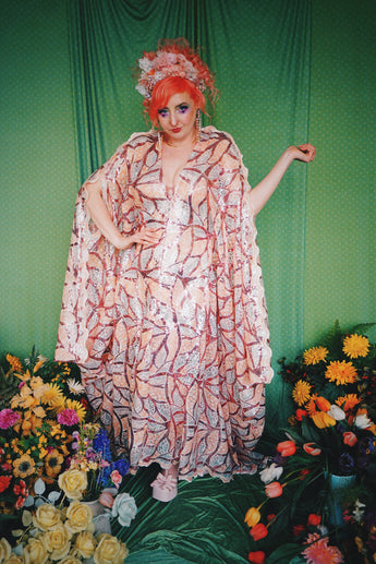 Art Deco-inspired sequin kaftan with huge bell sleeves and a leafy pattern of sequins in white, silver, pink and salmon - worn with our hidden ribbons tied to cinch in at the waist (can also be worn loose).