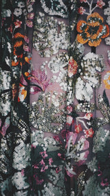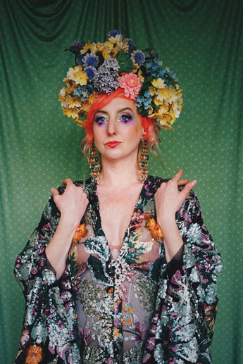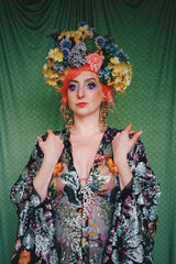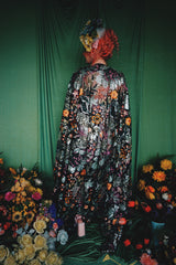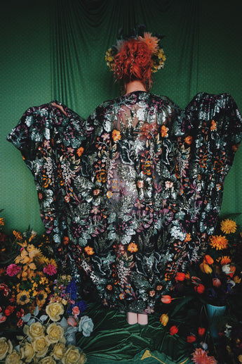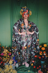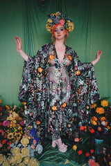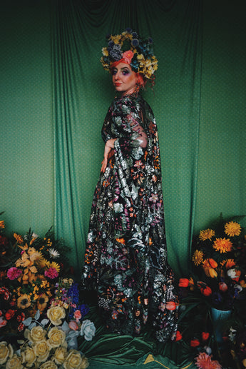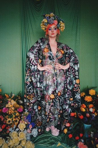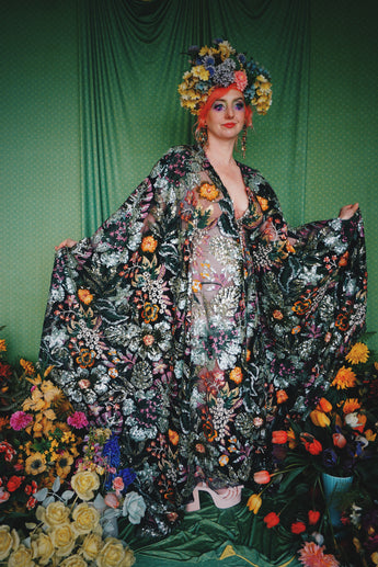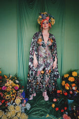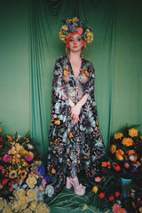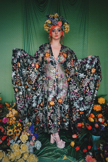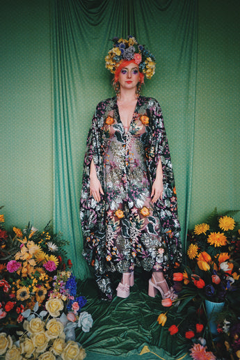 A stunning array of embroidered and sequinned flowers on a black mesh back in our v-neck kaftan gown design with extra-long draping bell sleeves. The dress is semi-sheer and worn here with a nude body underneath, with our hidden ribbons tied to cinch in at the waist (it can also be worn loose).