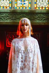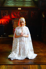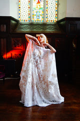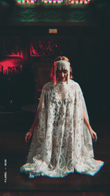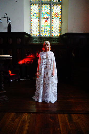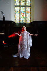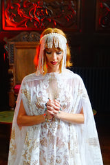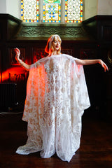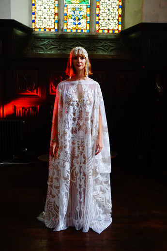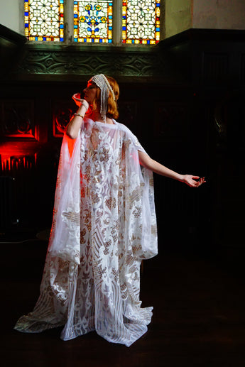 An exquisite white and gold sequin kaftan gown on white mesh. Made in our major sleeve style, the dress is extra wide, masses of fabric with wonderful drape to the sleeves and a v-neck style finish. Made with extra large drooping sleeves (sewn together with a gap for the arms to fit through) and our hidden ribbons.