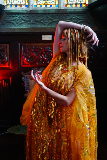 An exquisite adornment of yellow and gold on matching yellow mesh, which looks to simply drip off the body…