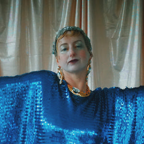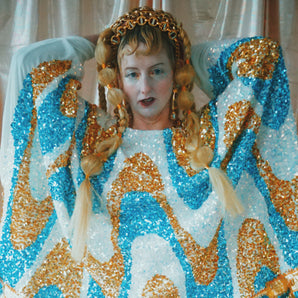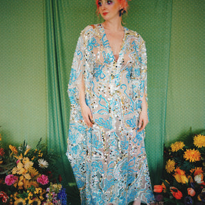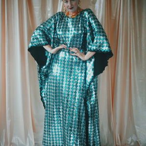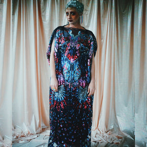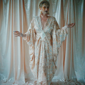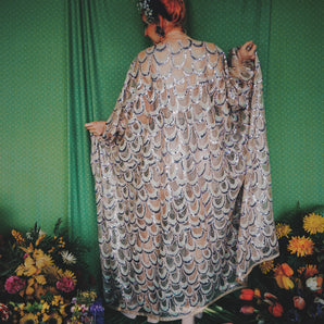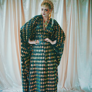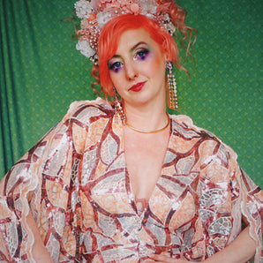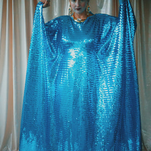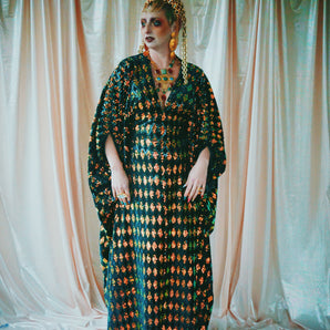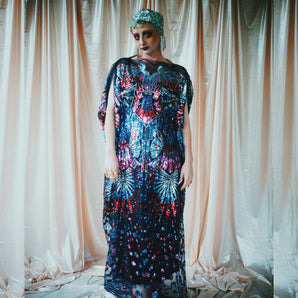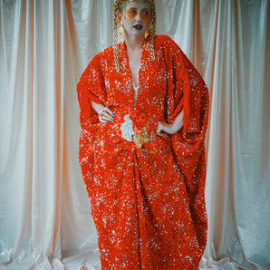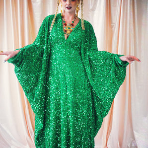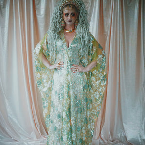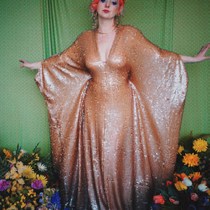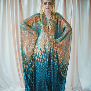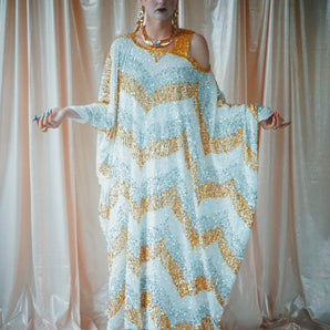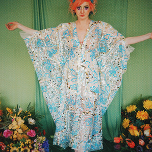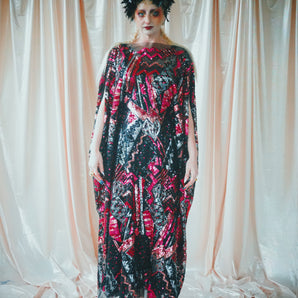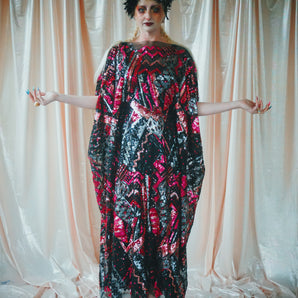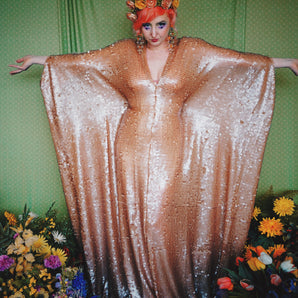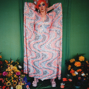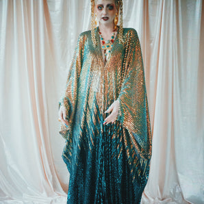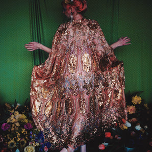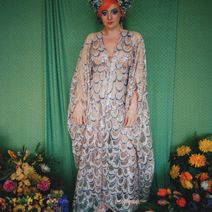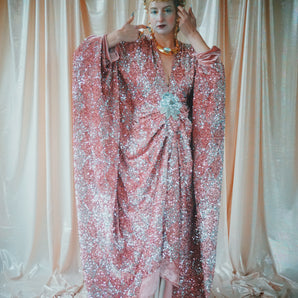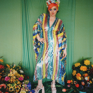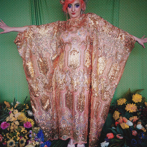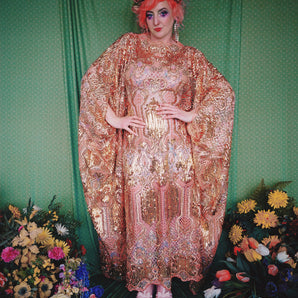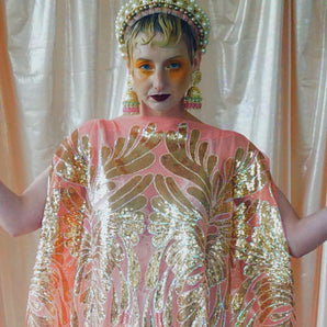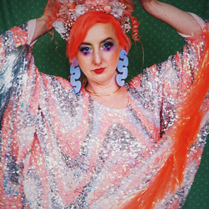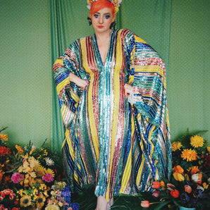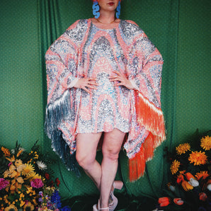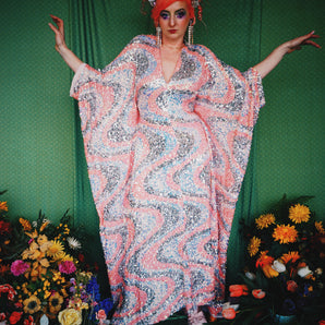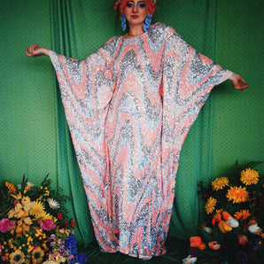 Quick view Candy Floss Swirl Sequin Kaftan Mini Gown with Tinsel Fringing £225.00 /Iridescent Pink and SilverIridescent Pink OnlySilver OnlyNo fringingAvailable in 4 colorsSold out