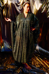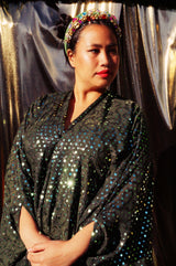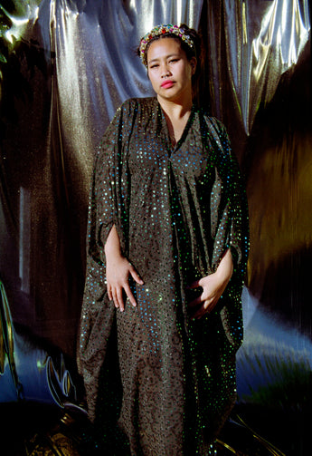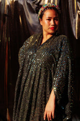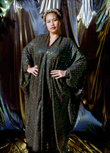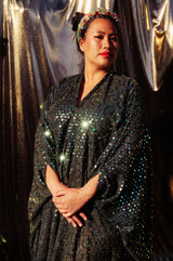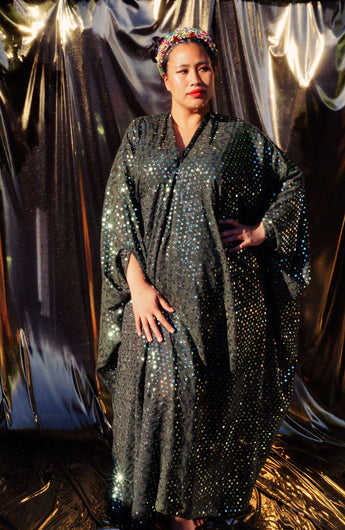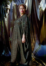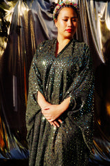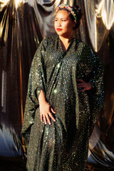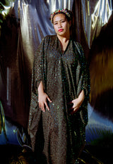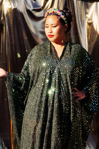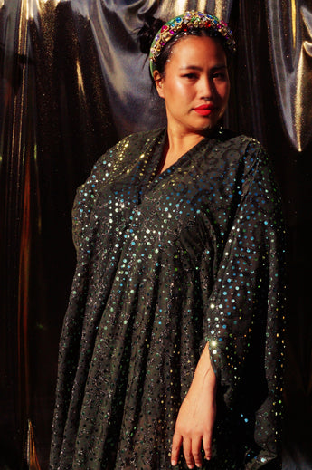 Beautiful bottle green glitter embroidered chiffon fabric with 3mm sequins scattered throughout in a Maxi gown / kaftan dress style with a v-neck plunge and front split (can be altered if desired - just add a note to your order). The dress can be worn loose and free or tied with our signature hidden ribbons for a more figure hugging look and is made from dead stock fabric, so very limited availability.