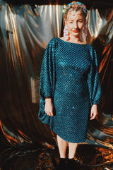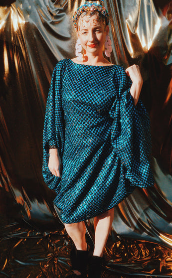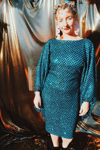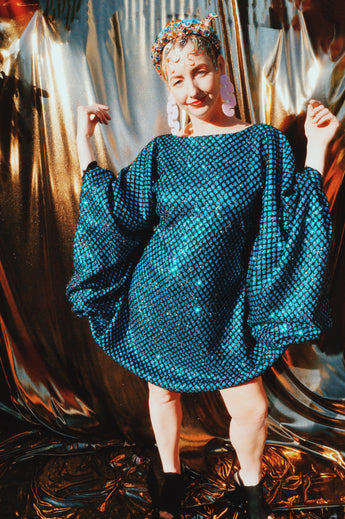 Stunning mini batwing Kaftan Dress in an incredible deadstock lurex black and glitter blue fabric. The dress is gathered at the sides, and becomes shorter as you raise you arms. You can wear loose and free or tie the dress with our signature hidden ribbons for a more figure hugging look. Made from dead stock fabric, so very limited availability. .