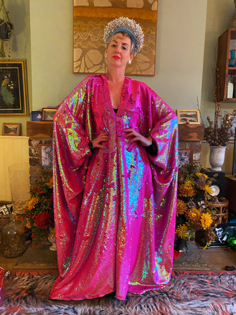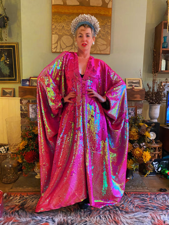 Sensational sequinned robe smothered in Hot pink flip sequins - shiny and iridescent pink one way and hot pink matte the other. There is no stretch to the fabric but is a free size with hidden ribbons that you can tie at the waist for a figure hugging look, or wear loose and free. Fabric is heavy but you can still move around in her.