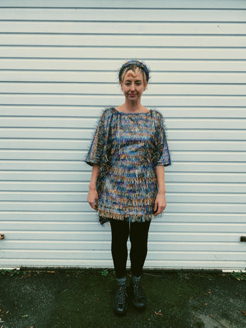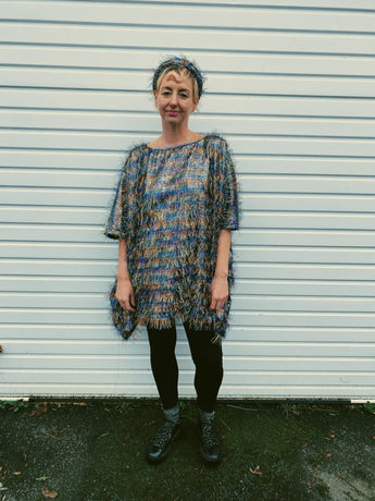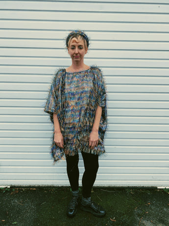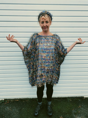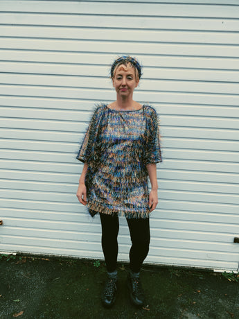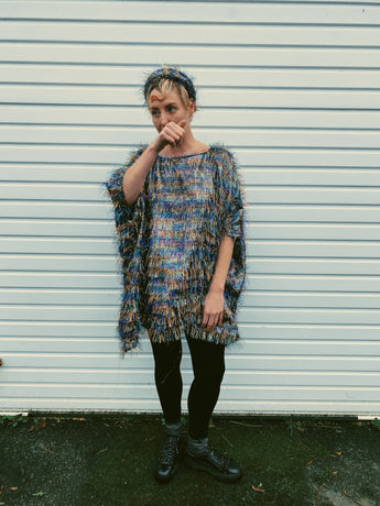 ANOTHER extra special version of our sellout tinsel maxi dress... this time in an icy blues, whites and bronzes iridescent monster hair tinsel.
