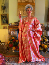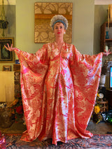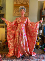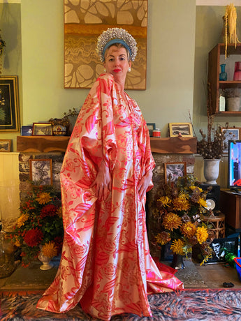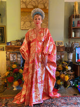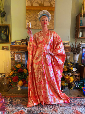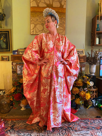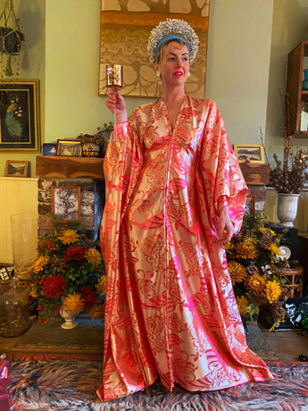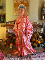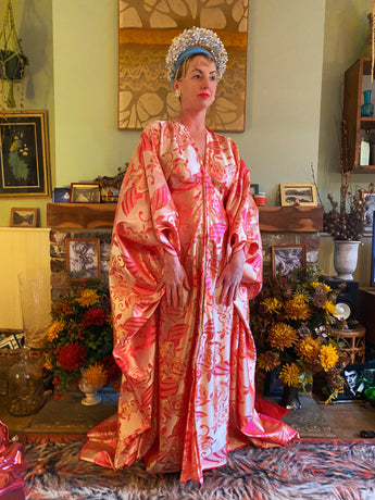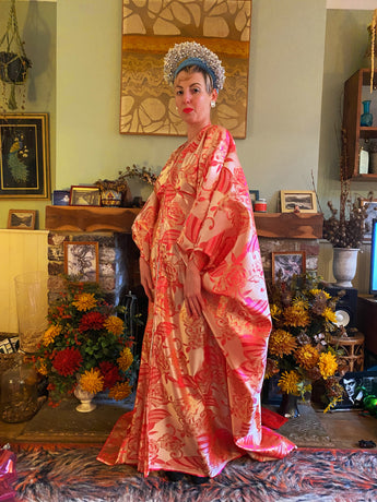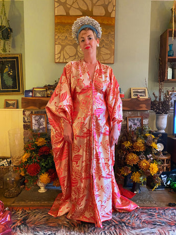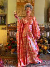Sensational brocade pink and gold fabric made into a kaftan dress with hidden ribbons which can be tied in at the waist or left loose and free fitting.