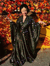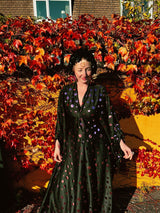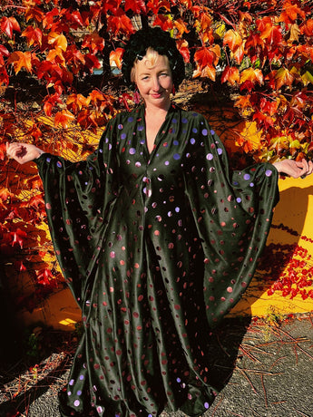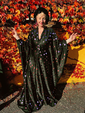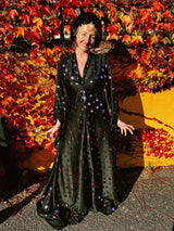 Super fun Maxi gown / kaftan dress with a v-neck plunge. Made from a black slightly shiny jersey stretch fabric covered in rose pink mirror sequin discs. The dress can be worn loose and free or tied with our signature hidden ribbons for a more figure hugging look.